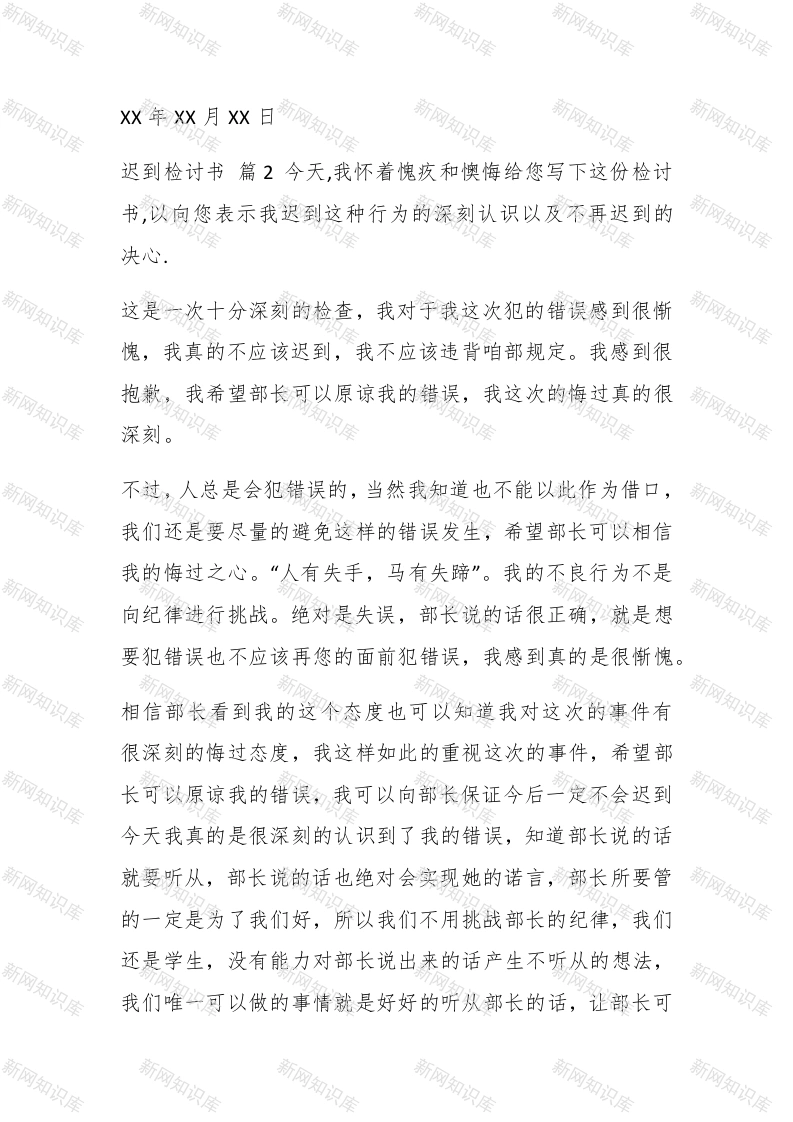 【精华】迟到检讨书范文汇编7篇【精华】迟到检讨书范文汇编7篇在不小心犯错后,为了避免再犯,我们要通过写检讨书来悔过,在写检讨书的时候要注意用语诚恳。那么对应的检讨书到底怎么写呢?以下是小编帮大家整理的迟到检讨书7篇,欢迎阅读,希望大家能够喜欢。迟到检讨书篇1今天是2月8日,是开学第一天正式上课的日子,我没有想到我居然迟到了,这真是太不该了,我想我可能有以下几个原因吧。1。是由于刚过完年,我整个人都还沉浸在过年的喜悦当中,还没来得及收心,整天就知道出去玩,整个心思没有放在学习上,所以才会导致我现在这个懒散的性格;2。是这过年的几天中,我每天都是凌晨23点钟才睡觉,中午才起来,还早饭都不吃,直接吃中饭,这样导致了我严重的睡眠不足,这样睡觉一直持续到无宵节那天,所以我才会出现早上迟到的这种不良现象,但是我现在已经意识到了这样是不对的,所以我现在已经改了,我知道我以前的睡眠是不健康的,会影响我今后的学习情况,所以从今晚开始,我将会把整个心思都投入到学习中来,重新回到这个学习环境当中,保证上课的质量和认真地完成老师布置给我们的每一份任务。描paidbegin#检讨人:Xx【更多公文素材,微信:dadawk01】