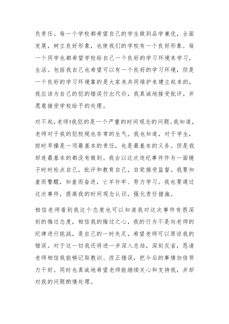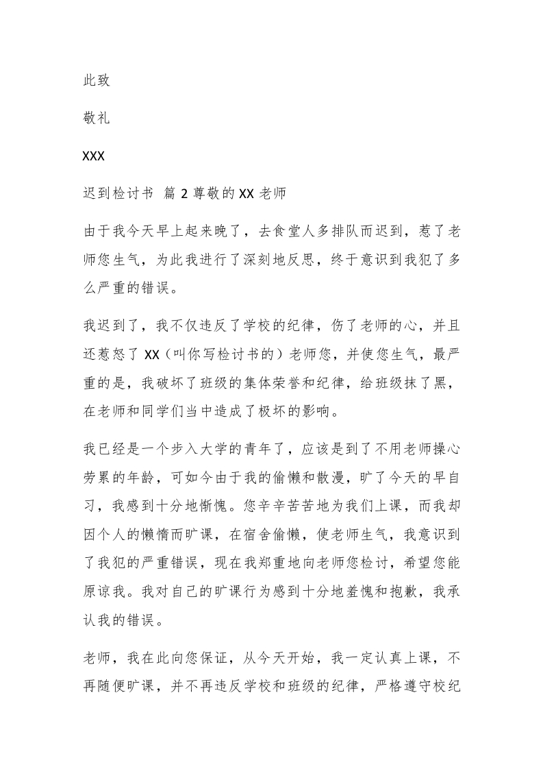 【精华】迟到检讨书锦集9篇【精华】迟到检讨书锦集9篇在某件事出现差错以后,为了避免再次出现相同情况,需要写检讨书来好好地检讨,请注意写检讨书要注意正确的格式。你所见过的检讨书是什么样的呢?以下是小编为大家整理的迟到检讨书9篇,仅供参考,大家一起来看看吧。迟到检讨书篇1尊敬老师:榭paidbegin#你好I这次早操迟到真的很不应该,我己经深刻认识到自己的错误,自己想了很多东西,反省了很多的事情,自己也很懊悔,很气自己,做为一个学生连基本的时间概率都没有,也深刻认识到自己所犯错误的严重性,对自己所犯的错误感到了羞愧。一个学校,学生都应遵循早操时间是个不变的规定,而我一直没有引起重视,没有重视学校这么平常的规定,这些都是不应该的。早操迟到也是对老师的不尊重。事后,我冷静的想了很久,我这次犯的错误不仅给自己带来了麻烦,也给同学起了坏影响,如果每个人都像我这样早操迟到那早操的次序就会被扰乱,其他同学也不能正常早操。而且我这种行为给学校也造成了及其坏的影响,破坏了学校的管理制度。在同学们中间也造成了不良的影响。由于我一个人的犯错误,有可能造成别的同学的效仿,影响班级纪律性,年级纪律性,对学校的纪律也是一种破坏,而且给对自己抱有很大期望的老师,家长也是一种伤害,也是对别的同学的父母的一种不