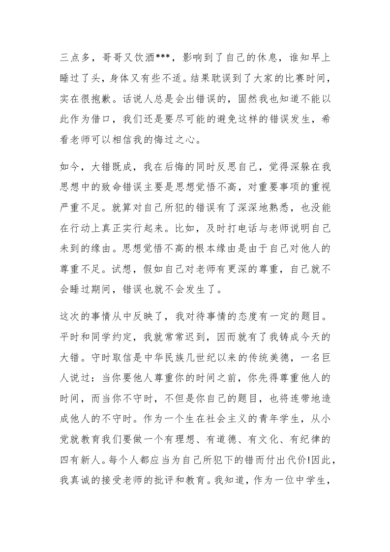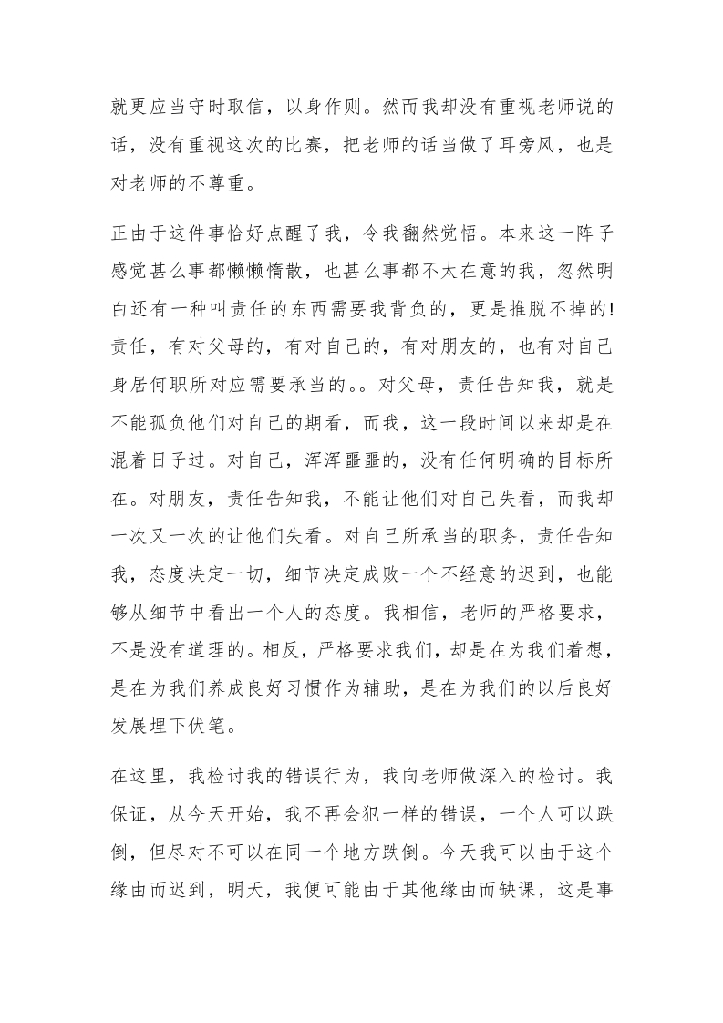 【精华】迟到检讨书集合四篇【精华】迟到检讨书集合四篇在学习、工作或生活中出现了问题或过错后,为了避免再犯,常常要求写检讨书,以对出现的问题和过错进行检讨,做事不能马虎,写检讨书也应如此。那么问题来了,到底应如何写检讨书呢?下面是小编整理的迟到检讨书5篇,供大家参考借鉴,希望可以帮助到有需要的朋友。迟到检讨书篇1对这次错误,自己检讨了很多,自己也很后悔,很气自己,也深入熟悉到自己所出错误的严重性,对自己所犯的错误感到了惭愧。在这里对老师及所有同学说声对不起。也希看老师能够谅解我这次所犯下的错误。【更多公文素材,微信:da dawk01】#paidbegin#迟到在现在看来也许是一个小小的毛病,但是一旦构成了迟到的习惯,对我们将来的事业和人生发展都会造成极其严重的后果。假如在一场生意谈判中迟到,将会使我的事业失往信誉,假如在一场任务中迟到,将会使我的国家失往重要的财产,假如将来我做了老师,在一次课上迟到,将会使我的学生对时间的观念变得淡薄,那末,我就是误人子弟的千古罪人。现在的我们常常对小错误感到无所谓,常常不能够重视自己的错误,但正是这样麻痹的思想,致使了我这样行为的发生。刘备教导他儿子时曾说过勿以恶小而为之就是说明在思想上要有防微杜渐的意识。这类意识在现在的我们心里过于淡薄了,今天这件事情的发生正是暴露了我们思想上的题目。今天的错误在我的人生长河中记下了重重的一记败笔!现在的我非常的痛心疾首,追悔莫及!听一名同学说一群同学等我一个人,还等了很久。我知道后很惭愧。由于前一天晚上,我对自己不是有很大的信心,因而多练了一会儿围棋。清晨