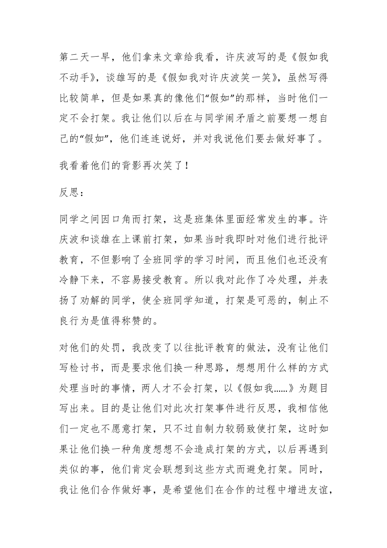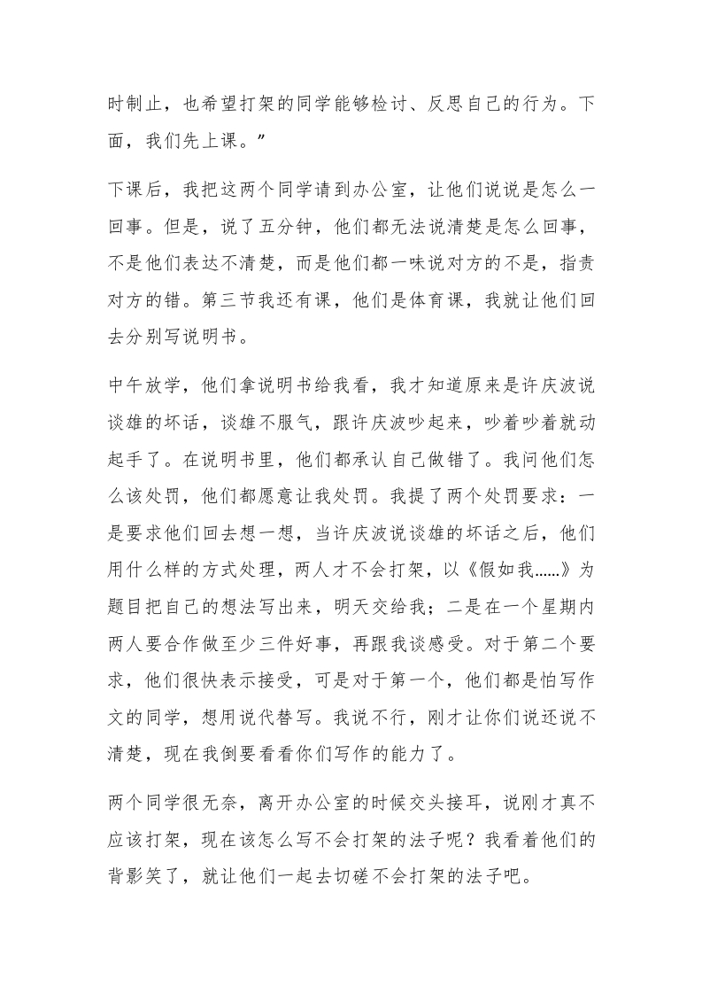 【精选】打架检讨书模板9篇【精选】打架检讨书模板9篇在不小心犯错后,为了避免再犯,为此要写检讨书来自我反省,在写检讨书的时候要注意语言真挚。那么问题来了,到底应如何写检讨书呢?以下是小编收集整理的打架检讨书10篇,仅供参考,希望能够帮助到大家。打架检讨书篇1郴paidbegin#上午第二节课预备铃刚响起,我正准备上课,班长刘明和中队长林翔急急忙忙跑来向我汇报:“老师,不好了,许庆波和谈雄打起来了!”一听这话,我急忙跑到教室,只见教室后门旁边,六七个同学分别抱着许庆波和谈雄,不准他们接近,许庆波和谈雄相对站着,虽然停止了打架,但两个人火气都很大,握紧拳头,好象随时要出手似的。我走到他们跟前,他们不敢看我,看样子他们刚动手就被同学拉开了,都没有受伤。这时,上课铃响了,劝解的同学开始散开,回自己的座位。大家都看着我,等着我对这两个惹祸的孩子作判决。为了不影响上课,我决定下课再处理这件事,我对全班同学说:“我对刚才发生同学打架的事感到难过,不过,令我感到欣慰的是李冲、韩茹、刘明、林翔等几位同学及时出手劝架、解围,使这起打架事件变小了,我代表全班同学表扬这几个同学,希望大家向这几位同学学习,发现有不良现象能够及