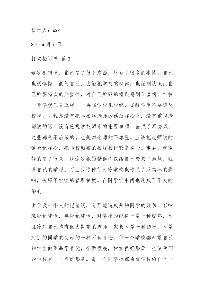 【精选】打架检讨书模板九篇【精选】打架检讨书模板九篇在学习、工作或生活中出现了过错后,为了避免再犯,我们要通过写检讨书来进行自我反省,写检讨书的时候要注意内容的完整。问题来了,检讨书应该怎么写?下面是小编精心整理的打架检讨书9篇,仅供参考,大家一起来看看吧。打架检讨书篇1郴paidbegin#尊敬的班主任老师:今天上午课间体息时,我仗着自己身强力壮,欺负同班同学××。把他推倒在地,造成鼻破流血的后果。此事在同学们中造成极坏的影响,也违反了校纪校规。现为此专门做出检讨,请老师和同学们对我进行批评教育。我身为少先队员,却欺辱弱小同学,这种行为确实给少先队和学校脸上抹了黑,自己脸上也无光彩。事后,经过老师和同学们的批评.我认识到了事件性质的严重性,也从反面深刻地教育了我,触动了我。在此,我郑重地向××同学道歉,向老师和同学们认错,保证今后不再发生类似事情。今后。我一定从中吸取教训,要团结同学、帮助同学,做一个品学兼优的好学生,做一个合格的少先队员。老师和同学们,请看我的实际行动吧!