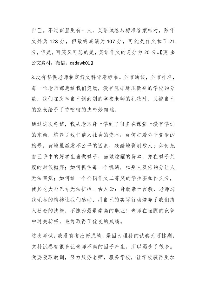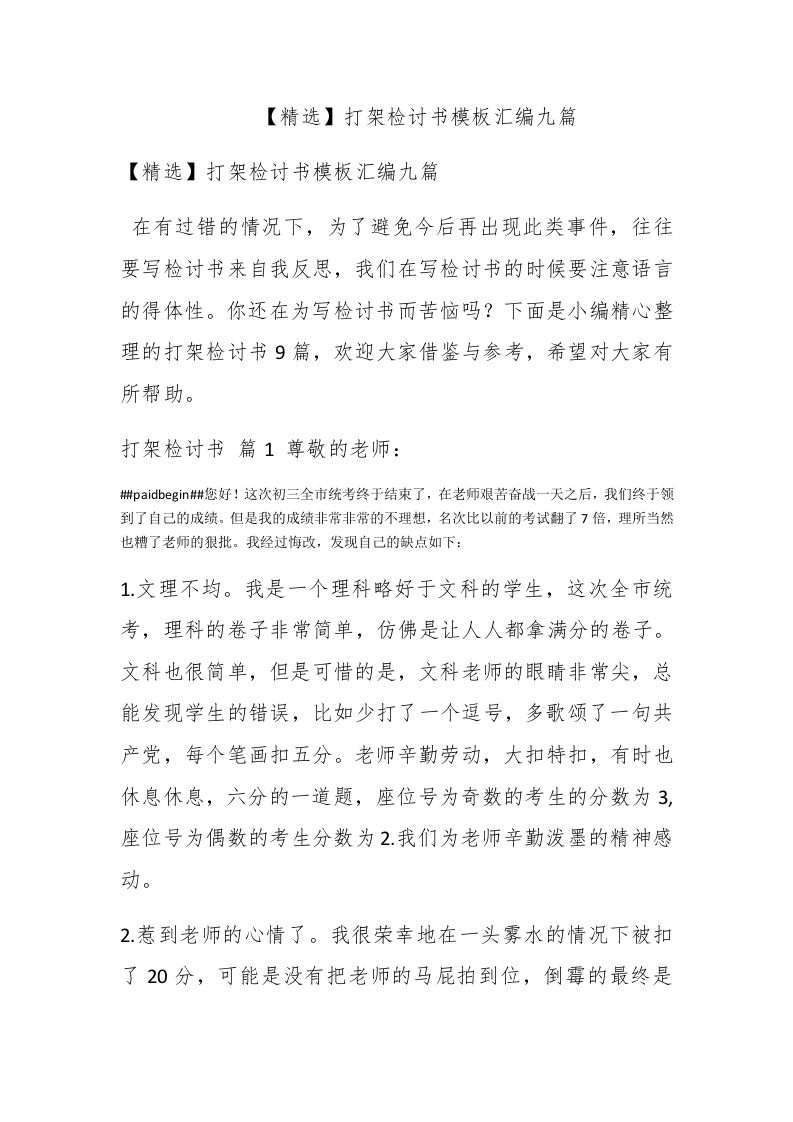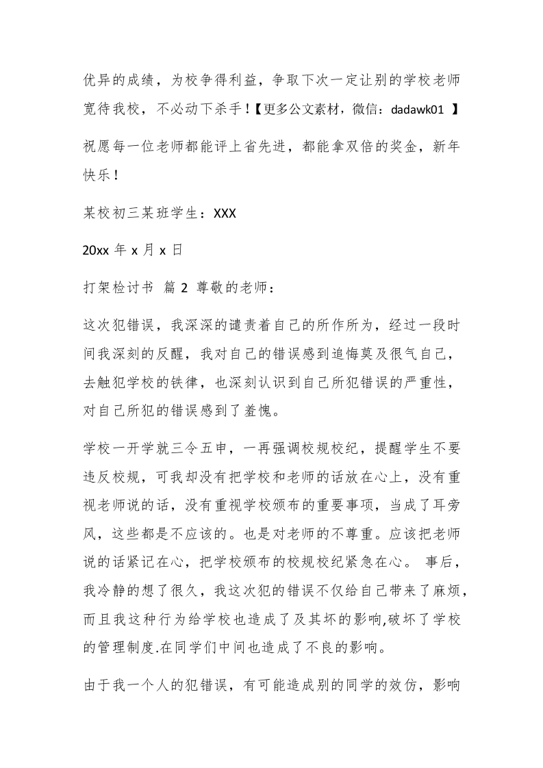 【精选】打架检讨书模板汇编九篇【精选】打架检讨书模板汇编九篇在有过错的情况下,为了避免今后再出现此类事件,往往要写检讨书来自我反思,我们在写检讨书的时候要注意语言的得体性。你还在为写检讨书而苦恼吗?下面是小编精心整理的打架检讨书9篇,欢迎大家借鉴与参考,希望对大家有所帮助。打架检讨书篇1尊敬的老师:榭paidbegin#您好!这次初三全市统考终于结束了,在老师艰苦奋战一天之后,我们终于领到了自己的成绩。但是我的成绩非常非常的不理想,名次比以前的考试翻了7倍,理所当然也糟了老师的狠批。我经过悔改,发现自己的缺点如下:1.文理不均。我是一个理科略好于文科的学生,这次全市统考,理科的卷子非常简单,仿佛是让人人都拿满分的卷子。文科也很简单,但是可惜的是,文科老师的眼睛非常尖,总能发现学生的错误,比如少打了一个逗号,多歌颂了一句共产党,每个笔画扣五分。老师辛勤劳动,大扣特扣,有时也休息休息,六分的一道题,座位号为奇数的考生的分数为3,座位号为偶数的考生分数为2.我们为老师辛勤泼墨的精神感动。2.惹到老师的心情了。我很荣幸地在一头雾水的情况下被扣了20分,可能是没有把老师的马屁拍到位,倒霉的最终是