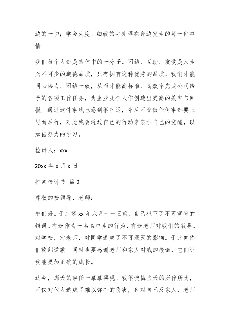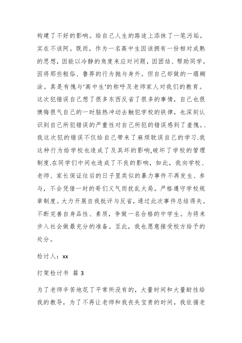【精选】打架检讨书模板锦集10篇【精选】打架检讨书模板锦集10篇在不小心犯错后,为了表明自己悔改的决心,我们要通过写检讨书来悔过,请注意写检讨书的心态要端正。那么对应的检讨书到底怎么写呢?下面是小编精心整理的打架检讨书10篇,欢迎大家借鉴与参考,希望对大家有所帮助。打架检讨书篇1郴paidbegin#亲爱的老师:那天,我与同学因一点小事发生了争执,后因双方争执到吵架,其次恶化到最后双方出手伤人。对于此事,认为我没有控制好自己的情绪,所以才会先出手打人经过这几天的反复思考,我觉得自己的行为是幼稚、冲动的。经过这件事这几天也明白了许多,做人要有忍让度的道理,不管做什么事情都要忍;人的修养关键在于控制自己的情绪,用嘴伤害人,是不道德的行为,双方动手打人更是最愚蠢的一种行为。在这里我做出深刻的检讨!一个人成长的过程,是要学会管理好自己的情绪。我们的情绪失控,通常是因为内心的不良情绪影响着我们,以体现一个人的内心还不够强大、成熟、稳重;人一生要学习和接触的事情还太多太多,我要学会去认真看待、宽容、包容我身