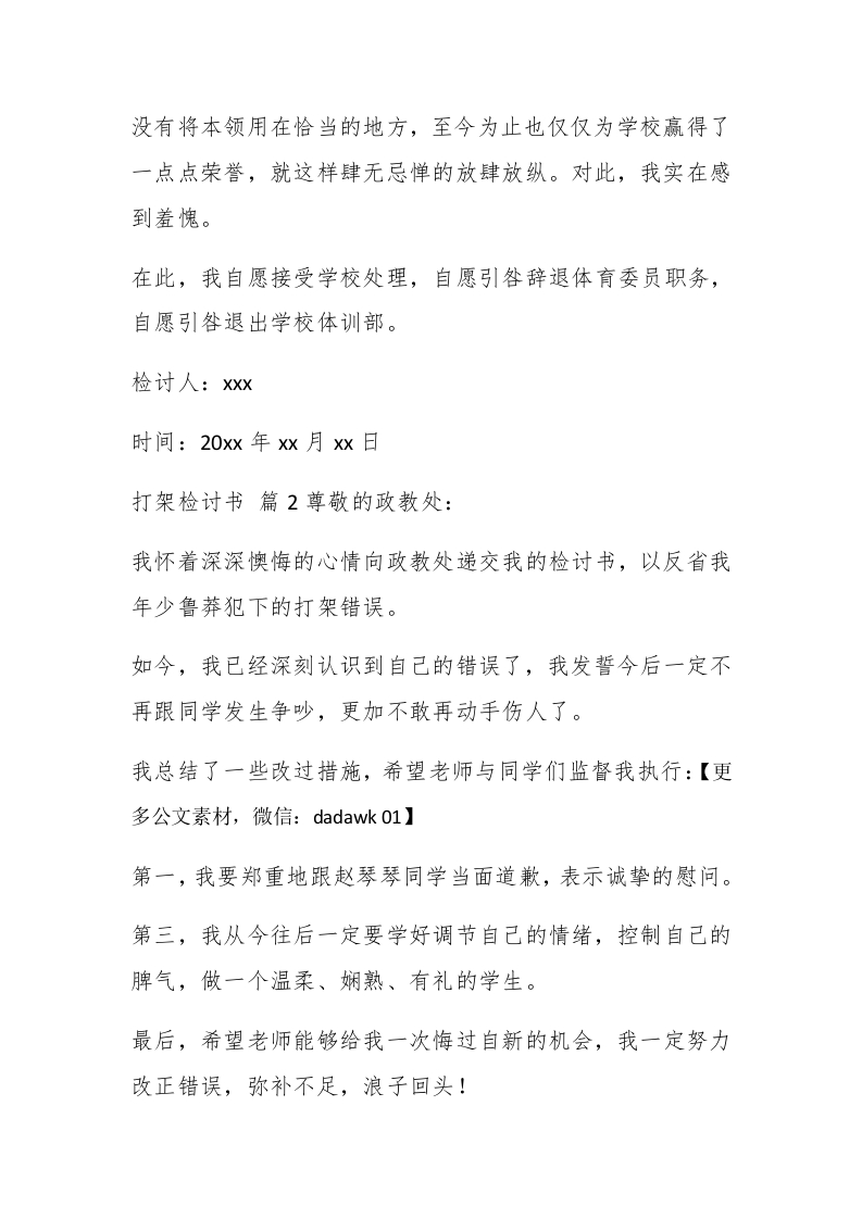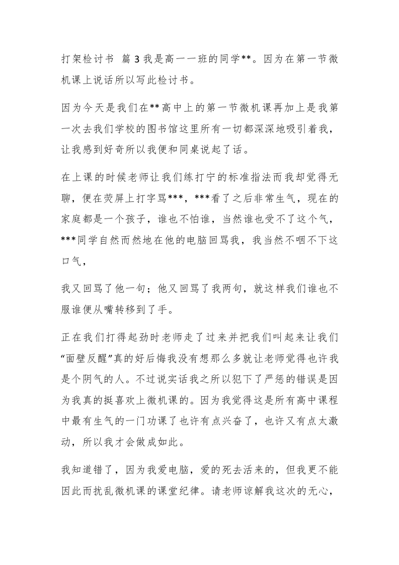 【精选】打架检讨书范文合集8篇【精选】打架检讨书范文合集8篇在学习、工作或生活中犯错后,为了避免再犯,要求以书面的形式,对自己的行为作出检讨,写检讨书的时候一定要有承认错误的意识。相信大家又在为写检讨书犯愁了吧!以下是小编精心整理的打架检讨书8篇,欢迎大家借鉴与参考,希望对大家有所帮助。打架检讨书篇1尊敬的各位领导、老师:榭paidbegin#今天,我们班级在下课期间发生了打架事件,严重地违反了学校纪律,造成教室一片混乱,违反了校纪班规,让领导、老师们为此揪心烦恼。根据《小学生日常行为规范》与《小学生守则》的规定,我们严重违反了第五章关于禁止学生参与打架斗殴的规定。面对我们班级出现这样严重的纪律问题,我感到非常的难过与痛心。对此,我深感对不起老师、对不起领导、对不起父母,更加对不起为我们营造这么良好教育环境的历代学校教育工作者。在这次下课打架事件当中,我扮演了一个带头人的角色,造成了严重的负面影响。我身为班级体育委员,身为一名班干部竟然这样的无视校规班规,仅仅为了发泄愤怒就动手打同学,导致同学轻伤,我真是万万不应该。我作为一名体育委员,学校体训部成员,空有一个好身体,
