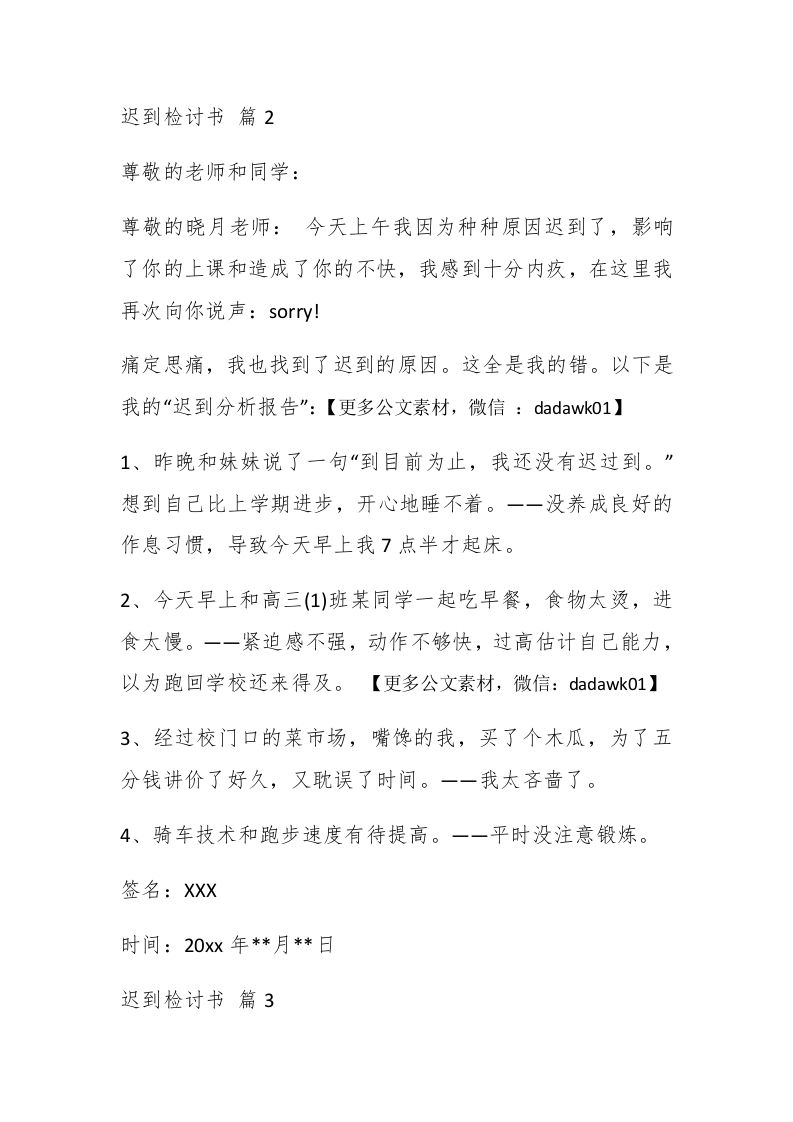 【精选】迟到检讨书模板汇编7篇迟到检讨书篇1尊敬的领导:您好!郴paidbegin#今天上午,我迟到了,可是我觉得现在说理由,都只是托词,我不想再为自己的错误找任何借口,那只能让我更加惭愧。所以,我只想为上午的培训迟到行为表示歉意和检讨。对于准时到刚培训,我一直都没有特别重视,经常迟到几分钟,觉得这没有什么,其实这是一种非常不好的习惯。一方面,这反应了一个员工的对于公司规章制度的重视程度,对工作的认真负责程度,另一方面,这会给同事和部门带来了不好的影响。更应该杜绝迟到的行为。其实,我只要将闹钟调早10分钟,就可以避免迟到,可是我却没有这么做,归根到底还是思想上的问题。我决心,从思想上重视公司的规章制度,提高自己的思想觉悟,每天努力工作,做到爱岗敬业,希望领导及各位同事能够接受我真诚的歉意,并能来监督我,指正我。如果再出现类似迟到的事情,我甘愿受到公司规章制度的处分。检讨人: