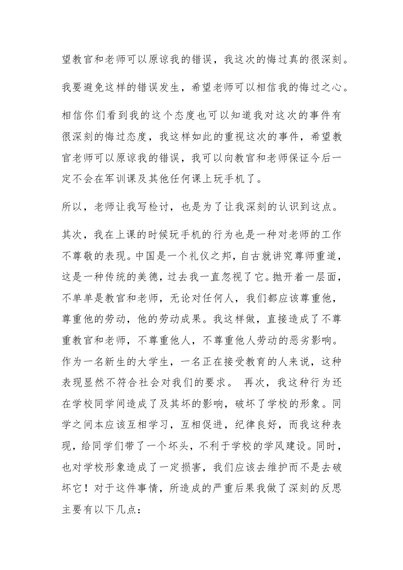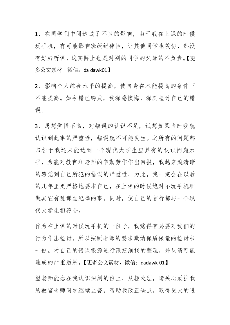 【精选】迟到检讨书模板锦集5篇当我们做某件事,出现了失误后,要求以书面的形式,对出现的问题或过错作出检讨,我们写检讨书时千万不能马虎应付。其实很多朋友都不知道怎么写检讨书吧!下面是关于迟到检讨书5篇,仅供参考,欢迎大家阅读。迟到检讨书篇1尊敬的教官、尊敬的老师、亲爱的同学们:【更多公文素材,微信:dadawk01】榭paidbegin#今天,我怀着愧疚和懊悔给你们写下这份检讨书,以向你们表示我对上课玩手机这种不良行为的深刻认识以及再也不在上课的时候玩手机的决心。现在想起我当时的行为,我是千般懊恼,万番悔恨。在目前的情况下,尤其是军训期间,我利用这宝贵的学习时间来玩手机,真是极其不该。这样的行为,不但是对教官和老师的不尊重,还是对我们这个集体的不负责,更是对自身的要求不严,约束不够。这不但使教官和老师对我产生了极为不良的印象,同时也令教官和老师对我们整个学院这个集体留下了很不好的印象,使我们集体的同学在校园内丢了脸了。我对于我这次犯的错误感到很惭愧,我真的不应该在练习军歌的时候玩手机,我不应该违背教官的话,违背老师的规定,我们作为学生就应该完全的听从教官和老师的话,而我这次没有很好的重视到教官和老师讲的话。我感到很抱歉,我希