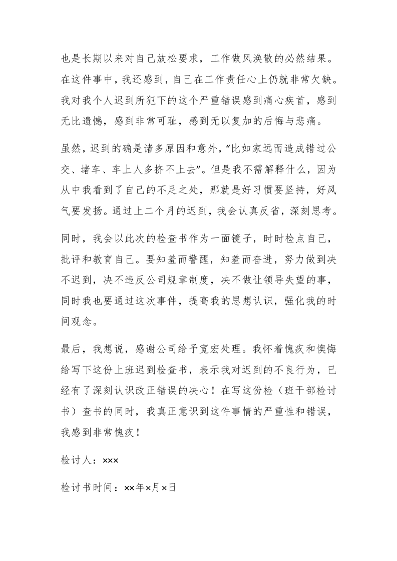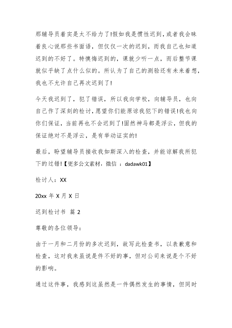 【精选】迟到检讨书模板集锦5篇【精选】迟到检讨书模板集锦5篇在有过错的情况下,为了避免再犯,往往被要求写检讨书来自我反思,在写检讨书的时候要注意用语诚恳。但是你知道怎样才能写的好吗?以下是小编精心整理的迟到检讨书5篇,欢迎大家借鉴与参考,希望对大家有所帮助。迟到检讨书篇1#paidbegin#尊敬的辅导员:您好!在此,我怀着非常繁重的心境向您做出深刻的检讨!身为一名大二的学生,还要为迟到而写检讨书,觉得十分的无奈和后悔!今天写下这份检讨书,是对我以后不再迟到而做出的信心。不晓得是您荣幸还是我不幸,第一次迟到就被点名了,但无论如何,冲撞了学院的铁律,就要承当起自己犯下的错误!但我能够保障,迟到,仅此一次罢了,相对不会有下次。我不再是小学生了,自己的学习跟本人的将来我很明白,思维上的觉醒仍是很强烈的,你感到是吗?500字的检讨书我当初真的不知道该怎么写下去了,也不想为自己的迟到找更多堂而皇之的理由。如果还想要听我说什么迟到犯下了一个重大的错误,对不起父母对不起学校的话,