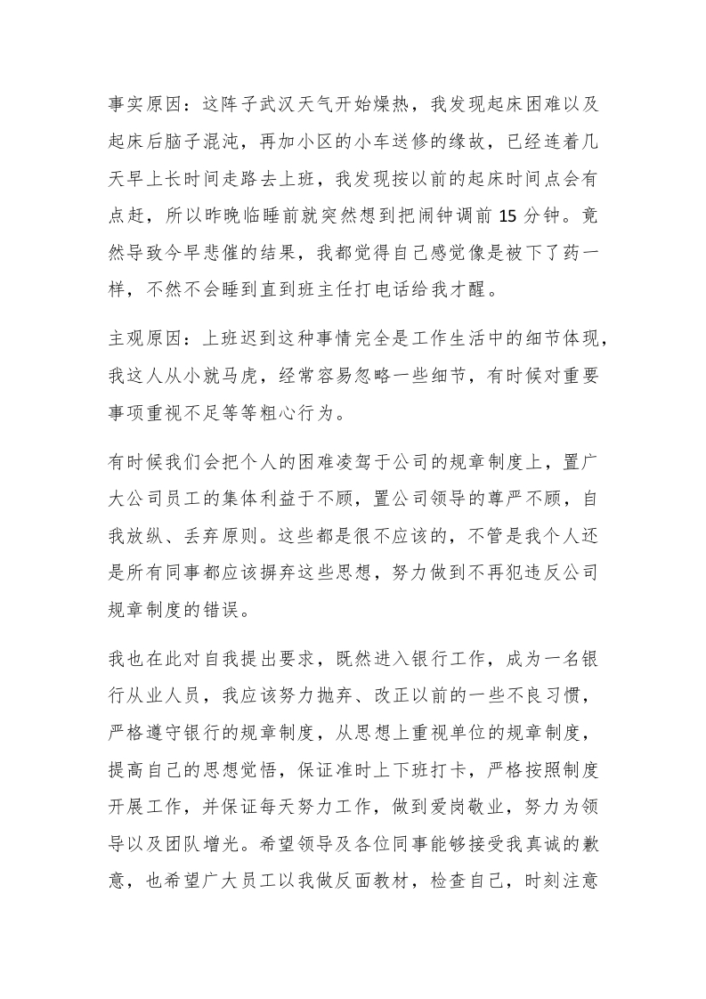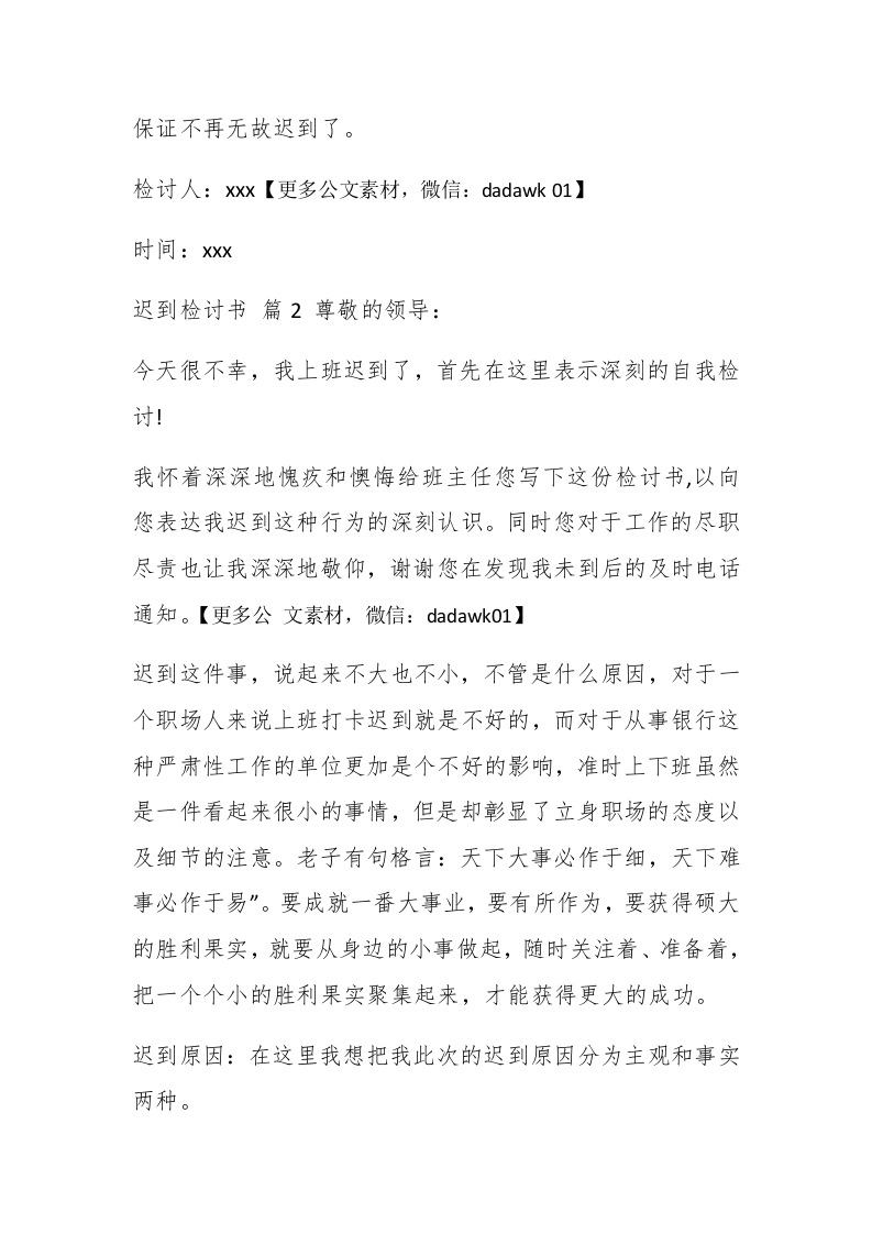【精选】迟到检讨书汇总十篇【精选】迟到检讨书汇总十篇在不小心犯错后,为了避免再犯,我们通常要用检讨书来悔过自新,做事不能马虎,写检讨书也应如此。那么正式、规范的检讨书是什么样的呢?下面是小编为大家收集的迟到检讨书10篇,希望能够帮助到大家。迟到检讨书篇1尊敬的单位领导:榭paidbegin#我怀着深深愧疚的心情递交这封上班迟到检讨书。上班迟到这件事,表面上来看是偶然发生,可实际上却是反映出我没有养成良好的作息规律,并且反映出我长时间没有对自己有严格要求,工作散漫等必然结果。我这样的自由散漫最直接的后果就是违反单位规章制度,久而久之会让我尚失工作责任心,养成“得过且过”、“做一天和尚撞一天钟”的应付思想。现在,我知道上班迟到的行为是非常可怕的,如果不加以改正与反省,很有可能导致自己就此沉沦下去,一蹶不振。工作当中,每个员工都是需要怀着一颗积极奋进的心态从事工作的,如此企业才能发展,业绩才能够提高。而我怎么能够连基本的生活作息也掌握不了呢,这样岂不是太没有组织纪律观念了。【更多公文素材,微信:dadawk01】所以,在此我愿意就上班迟到的错误接受领导惩罚,我真心接受批评。在今后的工作生活当中认真养成良好作息规律,