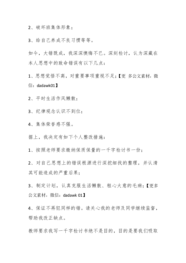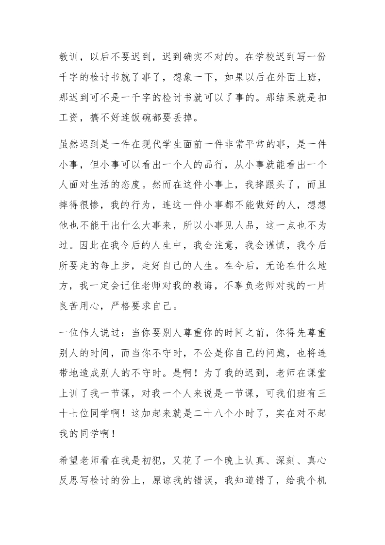 【精选】迟到检讨书范文汇编6篇【精选】迟到检讨书范文汇编6篇在不小心犯错后,为了表明自己悔改的决心,常常要求写检讨书,以对出现的过错进行悔过,在写检讨书的时候要注意用语诚恳。那么对应的检讨书到底怎么写呢?下面是小编收集整理的迟到检讨书6篇,欢迎大家分享。迟到检讨书篇120xx年3月17日,星期一的早自习,我迟到了。而在前一天晚上班会课,班主任老师已经三令五申,一再要求,全体同学必须按时上课,作息时间已改为春季的了,大家切记不要迟到!其实老师反复教导言犹在耳,严肃认真的表情犹在眼前,我深为震撼,已经深刻认识到此事的重要性。#paidbegin#迟到大概有半分钟之久,虽然半分钟不算很长时间,但也是迟到了。那么,为什么会迟到半分钟呢?想了想列出以下若干个原因:首先,起来得晚,七点二十上早自习,应该提前些起床,避免因为其他特殊未能及时预料的原因而迟到:其次,昨晚没按时睡觉,导致早上未能醒来等等原因。这此都是客观,可以成为一切迟到的理由,所以,真正迟到的原因还是主观方面!【更多公文素材,微信:da dawk01】主观上没有意识到迟到的严重性啊!由于一时的粗心大意,我酿成了今天之大祸,事后,我已明白,由于我一时大意造成的严重后果可能有如下:1、耽误老师和后勤处各位负责老师的正常工作;【更多公文素材,微信:dadawk01】