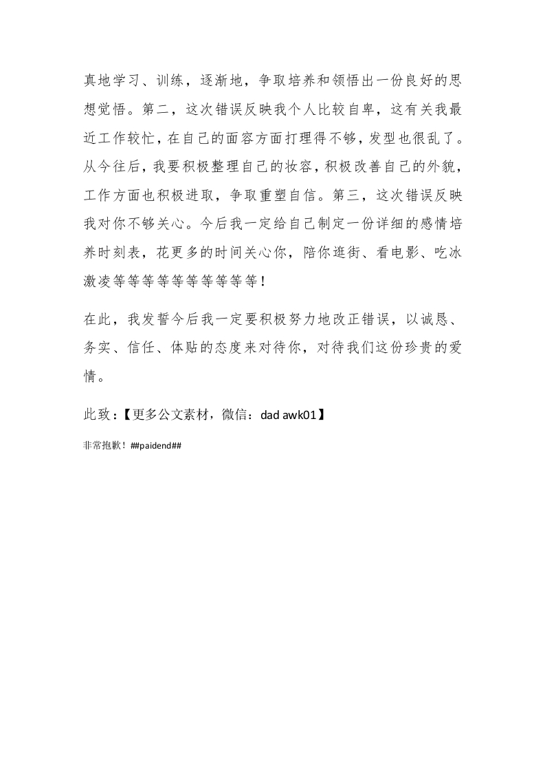 不信任女友导致感情危机的检讨书小童:自古云:“夫妻之情在于信”,虽然说究竟是哪位古人,我不怎么记得了,总之是非常伟大的一位名人。这句话说明夫妻关系建立在信任的基础上,倘若男女之间连基本的信任都没有,那么关系如何长久发展,这样不信任的感情终日在猜忌、担心中度过,对双方来说将是多么可悲的事。视转当下的我,正是犯下了这极为严重的错误,我这样的不信任行为给女友大人造成了很大的伤害,让女友大人这段时间的心情一直不好。每每想到这点,我就觉得非常愧疚,非常难过。郴paidbegin#在此,我向女友大人表示深深地抱歉。并郑重地向您说一句:非常抱款,我错了!对于我这样无比恶劣的行为,以下是我针对自己错误做出深刻的检讨和改正措施:第一,这次错误反映我在男女相处知识攻略方面存在的严重不足。通过这次错误的反省,我深刻明白了自己的错误,今后一定要加强对情感把握能力的重视,我也认识到这方面的才能、觉悟需要通过长期的学习积累和领悟。因此今后我抽空要积极去图书馆找情感相处相关书籍弥补,尤其是要从深层次上体会,“信任”在男女感情发展方面的重要性。努力认