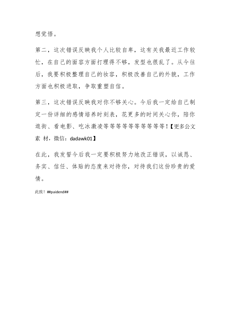 不信任对方的检讨书自古云:“夫妻之情在于信”,虽然说究竟是哪位古人,我不怎么记得了,总之是非常伟大的一位名人。这句话说明夫妻关系建立在信任的基础上,倘若男女之间连基本的信任都没有,那么关系如何长久发展,这样不信任的感情终日在猜忌、担心中度过,对双方来说将是多么可悲的事。视转当下的我,正是犯下了这极为严重的错误,我这样的不信任行为给女友大人造成了很大的伤害,让女友大人这段时间的心情一直不好。每每想到这点,我就觉得非常愧疚,非常难过。在此,我向女友大人表示深深地抱歉。并郑重地向您说一句:非常抱歉,我错了!擗paidbegin#对于我这样无比恶劣的行为,以下是我针对自己错误做出深刻的检讨和改正措施:第一,这次错误反映我在男女相处知识攻略方面存在的严重不足。通过这次错误的反省,我深刻明白了自己的错误,今后一定要加强对情感把握能力的重视,我也认识到这方面的才能、觉悟需要通过长期的学习积累和领悟。因此今后我抽空要积极去图书馆找情感相处相关书籍弥补,尤其是要从深层次上体会,“信任”在男女感情发展方面的重要性。努力认真地学习、训练,逐渐地,争取培养和领悟出一份良好的思