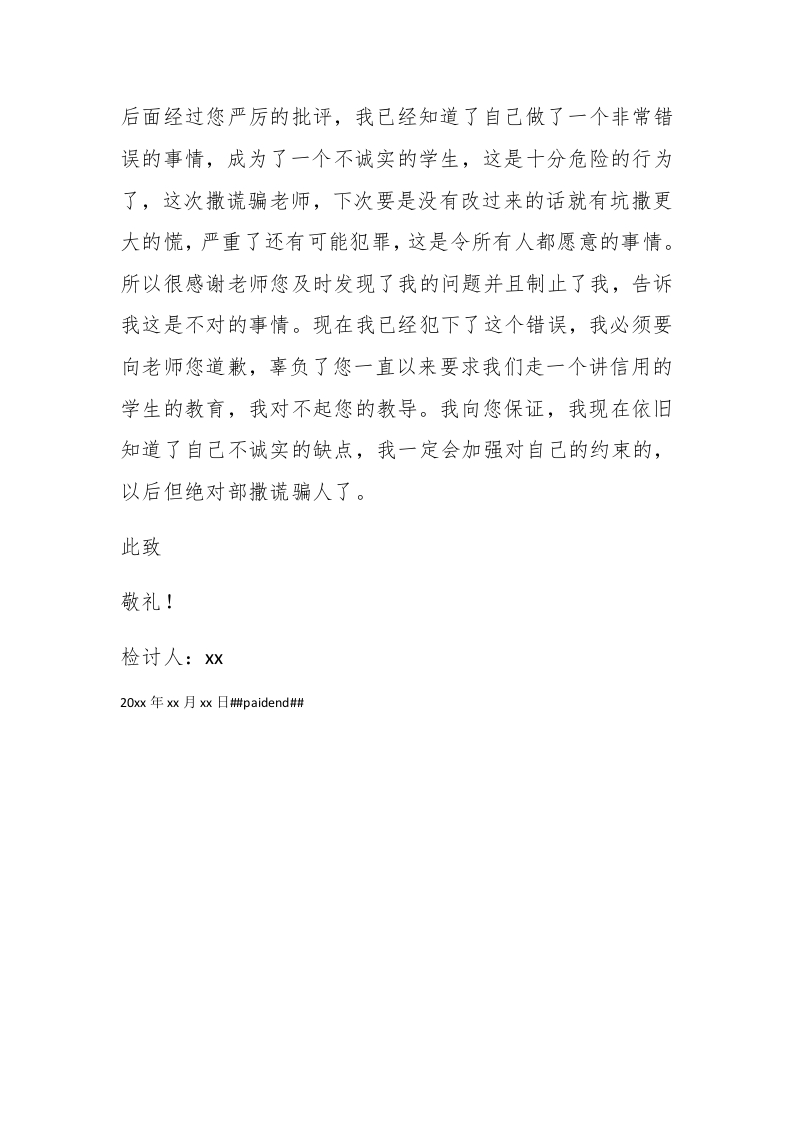 初中生对老师撒谎的检讨书初中生对老师撒谎的检讨书1尊敬的老师:您好!真的对不起老师,我不应该撒谎骗您的,我不是一个好学生,我对不起您平时对我们的教育,对不起您对我们的信任与看重,我实在是太过于混蛋了,竟然撒谎欺骗老师,我现在真的知道错了。感谢老师您的批评与教诲,让我从自己自私自利的思想中清醒过来,让我意识到自己思想上有许多的缺陷,让我知道我不是一个诚实的学生,只是我之前一直没有意识到,直到老师您的教育才让我醒悟过来。我真的是太过于糊涂了做是一个诚实的孩子是我们从小的时候和家长和老师就在讲的事情,都已经讲了这么多年的了我去还没有掌握住,还是不能够做一个诚实的孩子。这样的行为是让老师您失望,也是让家长因为我而蒙羞的事情,我实在是在错的太严重了,我对不起你们!郴paidbegin#学校是不准我们带手机来学校的,因为带手机来学校会让我们学习分心,从而影响了我们的学习,所以这个要求话特地通知了家长,让我们和家长都写了一个不带手机进入学校的保证书的,可是我上一周还是带手机来学校了,我也果不其然被分心了,在中午午休休总的时候玩手机被老师看见并且收缴了。可是手机被收缴了之后,我并没有认识到自己的错误,反而还起了歪心思,我后面利用家里的电脑在网上买了一个手机一模一样的模型机,然后子啊走天骗你说又是要联系家里人就从您那里拿回了手机打电环,之后我就用自己的模型机换了真正的手机重新交给您保管了。我本来以为是万无一失的,我拿到手机之后还在下课的时候偷偷的完了,以为是没事的,没想到被您发现了对老师您撒谎的事情,知道了那是一个假的手机。