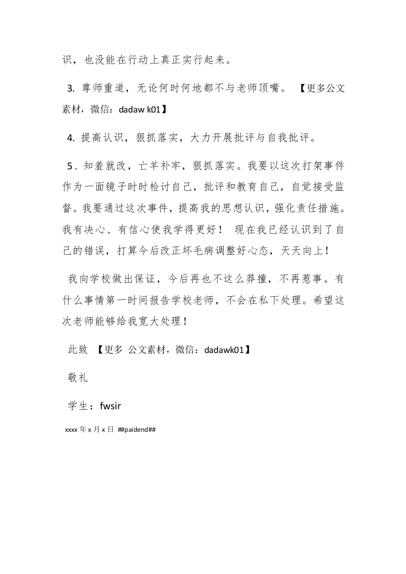 初中生打架检讨书尊敬的老师:您好!我是xx班的xx,我怀着十二万分的愧疚以及十二万分的懊悔写下这份检讨书,以向您表示我对打架这种恶劣行为的深痛恶绝及打死也不再违纪的决心。回想起昨天发生的打架事情,让我后悔不已。作为一名在校学生,打架斗殴实属不对。作为一名学生,就要有学生的样子,团结,友爱,是我们的本分。冲动不能解决任何事情,相反会弄巧成拙,破坏同学关系,失去老师信任。我对我的做法感到愧疚。在此,写此书以示悔过。#paidbegin#事情经过是这样的,(说一大堆经过)虽然事情的起因并不在我,但我动手打人,就是我的错。不管发生什么事情,心平气和的讲明白,就可以大事化小,小事化了。多一事不如少一事。作为一个学生,学会学习,并要懂得怎样在生活中做一个强者。遇到事情,我应该冷静面对。打架可以解一时之气,但并不能解决事情。打架不仅给自己丢了颜面,也给学校,老师,班级及父母,脸上抹黑。学生要有学生的责任,在对方撞人后,我却与他发生了肢体冲撞,这种社会习气,没有素质的表现,实在是不应该在学校发生,我为我所的事情感到羞耻与抱歉。在深刻的自我反思之后,我决定有如下个人整改措施:1.按照要求上交内容深刻的检讨书一份,对自己思想上的错误根源进行深挖细找的整理,并认清其可能造成的严重后果。2.思想觉悟不高,对重要事项重视严重不足。就算是有认