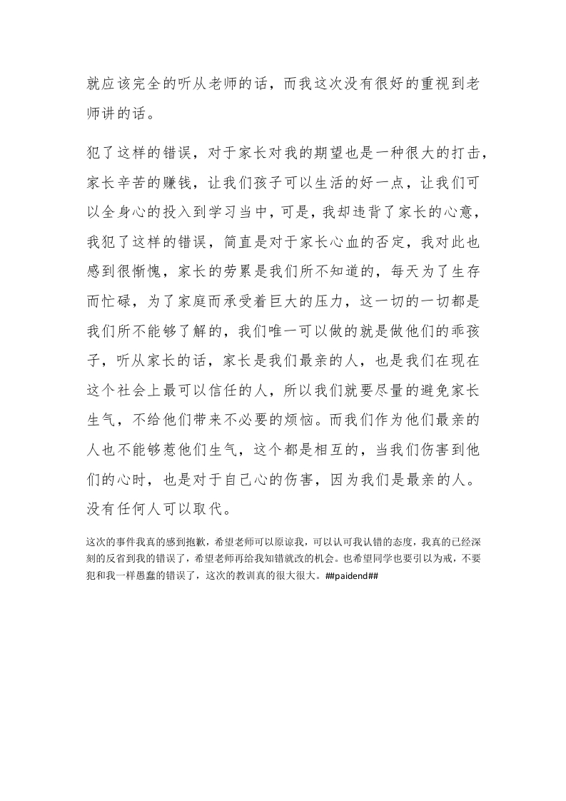初中生打架检讨书范文400字初中生打架检讨书(一)这次的打架事件给班级班风蒙受了巨大影响,给同学们树立了积极不好的示范。我真的觉得很对不起。我深切、愧疚地想您说一句:对不起,我错了,我悔不当初。经过近三天的深刻反省与面壁思过。我学习到,在校学生应该努力搞好学习,要将全部精力都运用在学习上,不应该去想其他的事情。#paidbegin#最最不应该的是因为一些口角冲突就跟同学发生肢体冲突,这样的打架事件影响恶劣,打架也是那种极坏的学生才有的事情,不应该发生在我身上。这次事件让我痛苦万分,因为当时的一时冲动,我犯下了如此严重的错误,我觉得最最对不起的就是班主任老师,还有我的父母。老师,我决定今后再也不打架了。我会努力学习,力争改掉身上所有的坏习惯,成为一个好学生,我要不断反思自己,不断发现和纠正自己的缺点,下一阶段我会好好表现好的。希望老师与同学们监督我!特此检讨!初中生打架检讨书(二)我真的不应该打架我不应该违背老师的规定,我们作为学生