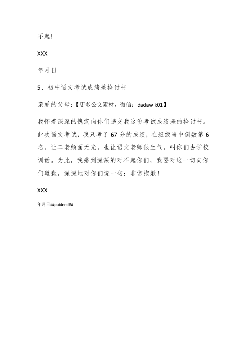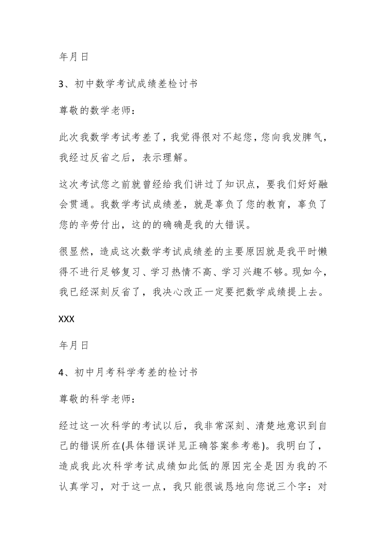 初中考差检讨书1、初中考差检讨书尊敬的老师:【更多公文素材,微信:dadawk01】在以前的学习中,我没有认真努力,这次没考好,现在想起来非常后悔,今天,我怀着愧疚和懊悔的心情,写下这份检查。以向您表示我的决心和悔改之意,只希望您能够给我一个改正错误的机会。谢谢您。#paidbegin##XX年月日2、初中考试考差检讨书尊敬的老师:您好!首先,我在此向你说一声对不起,我辜负了您对我的殷切希望。在这次期末数学考试中我惨败而归,不仅伤透了你的心,也让我无地自容。这次失败的原因,我分析了一下试卷,有绝大部分是由于我的马虎粗心造成的,但也有少数部分我不懂。您平常也就经常告诫我们,可我就是改不了粗心大意的毛玻不过,我不应该给我自己找理由,放心,老师,我会改正的。XXX