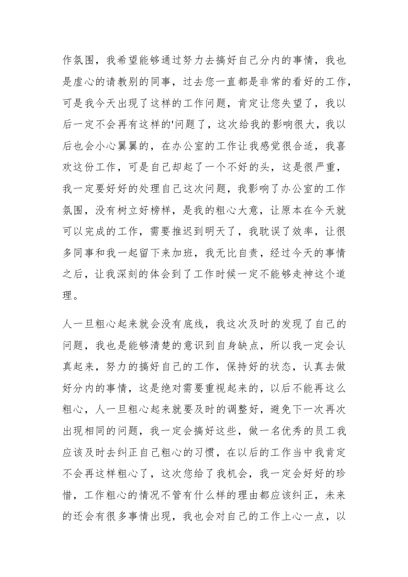 办公室员工工作粗心检讨书办公室员工工作粗心检讨书在学习、工作或生活中出现了失误后,为了防止此类事情再度出现,需要写检讨书来好好地检讨,请注意要带着改错的决心去写检讨书。你还在对写检讨书感到一筹莫展吗?下面是小编为大家收集的办公室员工工作粗心检讨书,供大家参考借鉴,希望可以帮助到有需要的朋友。尊敬的领导:paidbegin#您好!【更多公文素材,微信:dadawk 01】我是x,我今天的表现很不好,这让我感觉很是惭愧,由于我的粗心,我真的是感觉很自责,在这样的情况下面我让您失望了,未来工作若是再出现这样的情况,必然会出大问题在,今天我的工作没有细心做好,我的现在还是感觉自己没有做好的,以后的出现了问题就不好了,由于自己在工作当中粗心大意,我自己出现了这样的情况,这让您失望了,上班的时候我确实是走神了,我真的是感觉很不好,对于这次的工作我应该检讨一下。工作粗心大意肯定会出问题,办公会的工作气氛让我破坏了,今天我自己的工作没有做好,这间接的影响到了别的同事的工作,以后我也一定会用心去做好自己的工作,办公室的工