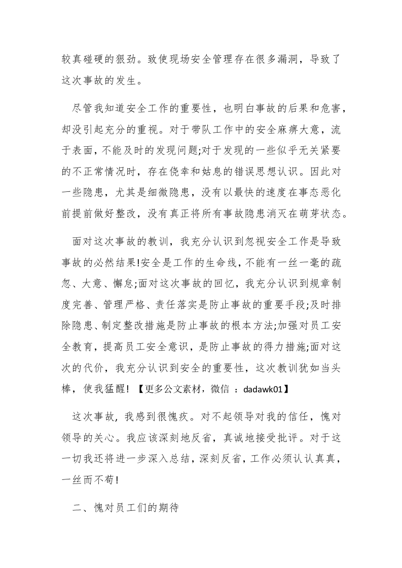 安全月关于安全工作失误检讨书检讨书的格式分为标题、称谓、正文和落款,内容包括出错问题、产生原因、改正措施或今后的打算。本文是小编为大家整理的安全工作失误检讨书,仅供参考。安全工作失误检讨书篇一:尊敬的领导、各位同事:拙paidbegin#***在6月6日发生了严重的人员工伤事故,给我**工作敲响了安全管理的警钟这件事故的发生,给公司正常的生产秩序造成了严重影响!反思事故,让我深深的感受到在我的安全管理工作上出现了漏洞,我悔恨交加,愧疚万分现向领导和各位同事做出深刻检查:一、愧对领导的信任这次事故的发生让我愧疚万分。由于我的工作失职,辜负了领导的信任。扪心自问,确实是由于我的工作没做到位才造成了本次事故的发生。对于这次事故,事后我感到非常后怕,自己感到深深地自责,没有为员工的生命安全负起责任。带队以来,关于安全问题,每次开队伍座谈会都会反复强调,但在操作技能方面总认为他们经验丰富,技术过硬,忽视了对这些人员是否符合岗位要求的现场跟踪和考核,没有及时准确的把握他们的操作技能水平,有针对性的教育培训不到位;对于安全风险提醒不够,关注不够,掌握不够。对一些不符合安全规范的行为,总是体谅多,纠正少,缺乏敢于