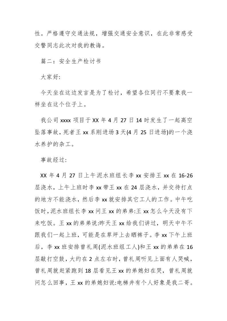 安全生产检讨书范本安全是一个永远都不可忽视的问题,下面是小编整理的关于安全生产检讨书范本,欢迎借鉴!篇一:违反交通安全法的检讨书范文尊敬的交警同志:郴paidbegin#因为我在主观意识上的错误,将我的别克轿车交付给我那还没有驾驶证的朋友去开。严重地违反了交通安全法规,给正常的车辆及行人交通造成不便,造成严重的安全隐患。如果万一发生交通意外,后果将是灾难性的,轻者给车辆和行人造成诸多不便,重则造成严重地人员伤亡和财产损失。如今被交警同志及时抓到,及时制止,及时教育,让我每每考虑到这些问题,心里都感到非常的悔恨和难过。我真的是犯错看,我愧对党和国家的培养,有负于家人朋友的期望。我承认我是一个四肢健全吗,头脑简单的老实人,我做人做事都实实在在。这次违规,我扪心自问是我犯了严重的错误。我也是有几年驾龄的老司机了,各种交通安全法律法规我可以说都谙熟于胸。但我今天却做出这样一桩糊涂事,我真巴不得给自己一耳光,好好抽醒我自己。但事已至此我还是要给交警同志您好好检讨,我要正视我的态度,我要为自己的行为负责。除交纳罚款之外,我还应该好好地让身边家人和朋友监督我,以后决不再犯下这样的错误。这件事之后,我要立誓做一个遵守交通规则的正义青年,要去参与交通安全知识教育,更加深刻的认识交通安全重要