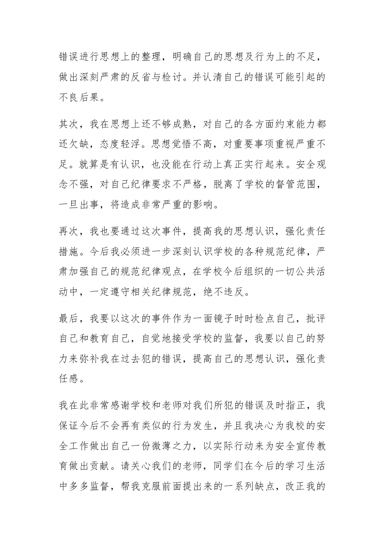 安全违纪的检讨书尊敬的老师:您好。此次违反了学校的安全规定,我很愧疚的承认我们违规使用了大功率电器-热得快,此次被检查小组没收且警告之后,我才觉悟到自己的安全观念不强,在纪律上对自己不够严格,对自己各方面的约束能力不够强大,对此我深感懊悔和愧疚。此次的错误行为让我认识到我思想纪律上的浅薄,导致造成不良的后果。这次犯错误,我反思了了很多,对自己感到很懊恼,也深刻认识到自己所犯的错误很严重,我对自己所犯的错误感到了羞耻。学校一再的强调校规校律,特别是近期进行的安全教育宣传活动,校园里面到处都是各种方式的安全教育宣传,我们却对此不屑一顾,这是一个很不良好的态度问题,此时我已经认识到了应该认真严肃的对待安全纪律的规定。我们这次犯的错误不仅给自己带来了麻烦,也给学校纪律造成了纪律破坏,在同学之间也造成了不良影响。我诚挚的怀着对此事表示很深刻的悔过态度,希望老师可以原谅我们的错误,我也会向老师保证此事不会再有第二次发生。#paidbegin#我们的错误造成了很不良的影响,我在此将会对此事进行深入的总结,自我反思,也针对自己的错误行为做出改正措施。首先,我将按照要求上交对自己的一份检讨,对自己所犯的