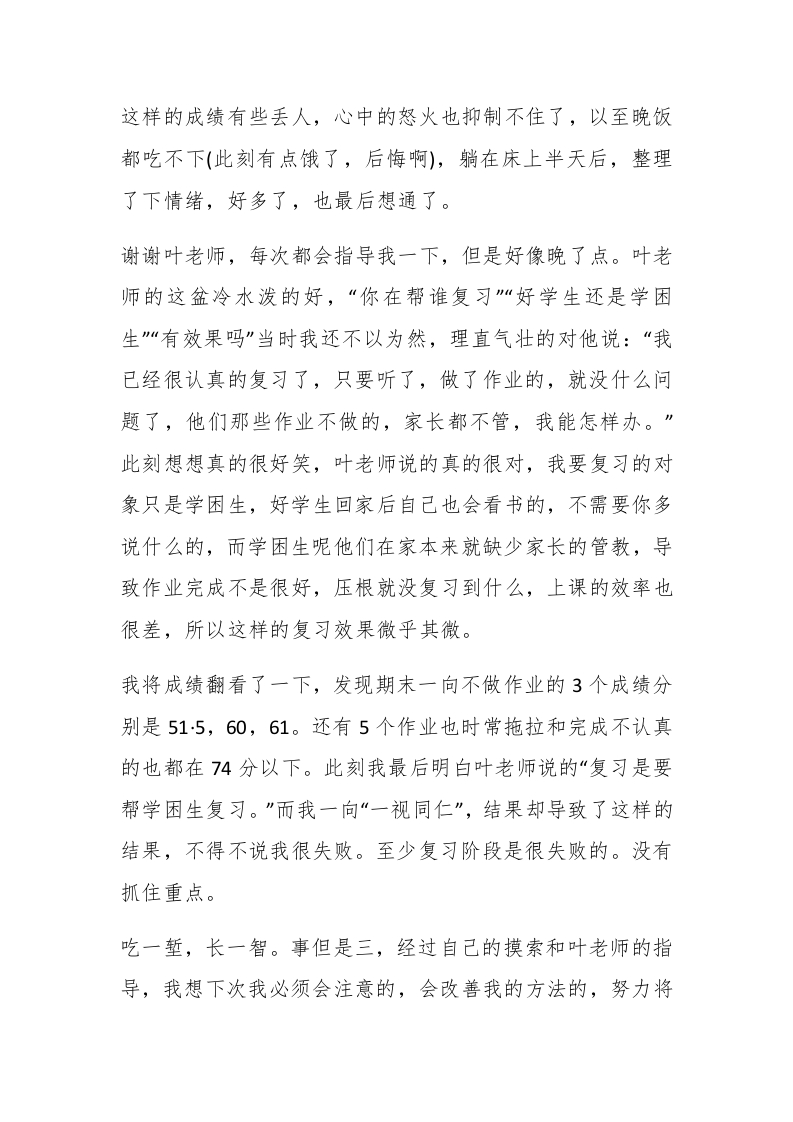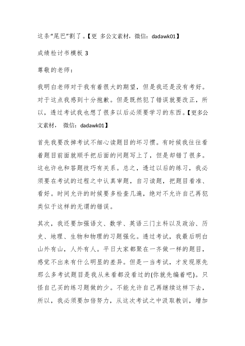 成绩检讨书模板成绩检讨书模板1这次期中考试,我考的很差,对此在这检讨,期望以后不要再考这个分数.…学英语,最重要的就是读,听,背,只要这三个你能100%做到的话,你的英语成绩,没有90分,也能85分。#paidbegin#但是,我却偏偏相反了,没有听,没有写,没有背,自以为事,以为自己多聪明,所以什么都只做了三分之一,导致成绩不理想…以后,我决定了,好好学习,天天向上,在此,我订了一份每一天必做的一份学习计划,我务必照做:1.每一天读英语课文,十次或五次。2.每一天不断的背单词,重复的背,直到背得滚瓜烂熟。3.每一天听写课文,直到会默为止。成绩检讨书模板2【更多公文素材,微信:dadawk01】期末考试结束了,成绩有些惨不忍睹,情绪一下降到最低点。其实刚开始时,我还有那么一些信心,因为试卷还算能够,比较细,难称不上,估计班级的平均分就应在80分以上吧,可谁明白结果竟然是76·6分。不及格的有2个(1个为随班跟读),及格为10人,良好为26人,优秀为2人。