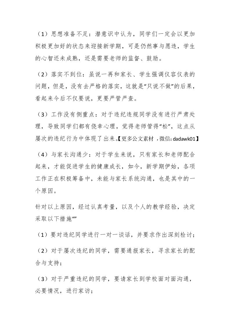 班主任工作失误检讨书范文近期,我班级的学生纪律涣散、学习注意力不集中,不论是学校检查还是班级自查都有这样或者那样的问题,针对这种情况,身为班主任我要进行自我检讨,写一份班主任工作失误检讨书,也希望同学们能够引以为戒,在今后的学习生活中更加积极主动,更加阳光和谐。近期工作失误的表现有:1、有个别男生未按学校要求简单短发,个别女生在学校留披肩发,这是校规明确禁止的,还有个别女生的指甲留的过长,这些现象都在学校的抽查中,有所体现,此外,校服不干净也是我们班常见的现象。郴paidbegin#2、有学生在走廊嬉戏打闹,这样做不仅有安全隐患,更是严重违反了校风校纪。【更多公文素材,微信:dadawko1】3、有三名同学未按学校要求佩戴校徽,有两名学生自习课说闲话,这些都是班级的基本纪律要求。作为班主任,我不想为自己的责任开脱,更多的对出现这些问题原因的反思:对于新学期刚开学就出现这种失误,我很自责,虽然是学生出了为题,但是“教不严,师之惰”,还是老师的教育教学工作没有做好,我觉得出现这种情况,有以下几个原因