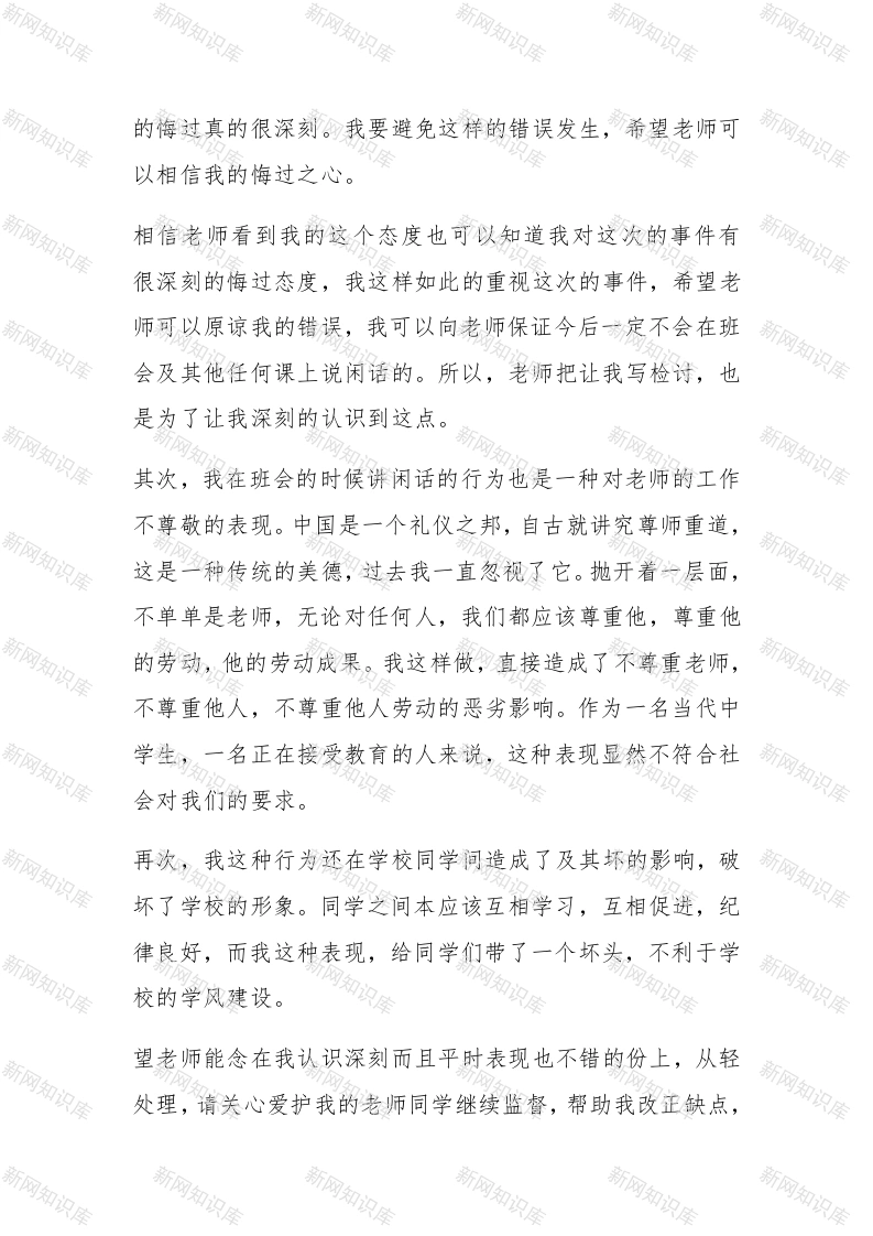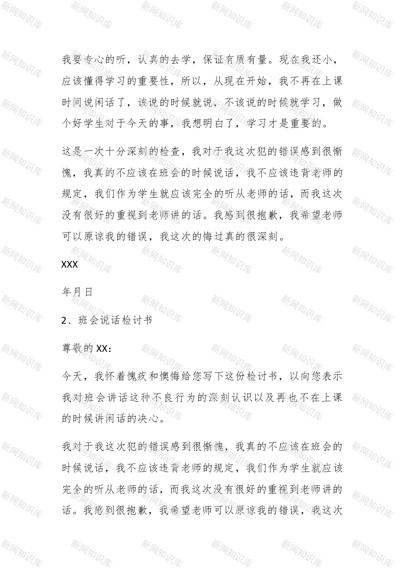 班会说话检讨书1、班会说话检讨书尊敬的XX:今天的班会上,我没有控制住自己的贪玩的个性,就不自觉地说了话,在此过程中,班长发现了我的这一严重错误,并及时地对我进行了指出和纠正。郴paidbegin#首先,造成班会讲话最直接的原因是我们自我约束力差了,作业完成以后,就觉得没事可做:间接原因是我们希望做点课业之外的事情,不免相互交流,说话声音无所顾忌之时,慢慢的自习课就沸腾了。当然,这不能成为自习课不遵守纪律的理由。鲁迅先生说过歌德也说我们只有认真反思,寻找错误后面的深刻根源,认清问题的本质,才能给集体和自己一个交待,从而得以进步。班会的时候,老师在认真的给我们学生讲事情,而我没有认真听讲,而是和其他同学在下面说话,更严重的是还若无其事的发出笑声,完全没有尊重老师,不仅打扰了别的同学听讲,还影响了老师讲课的好心情。老师批评了我,叫我反思,现在我想了好多,我觉得自己错的很不对。我不该班会说话,不该打扰大家学习,自己不学本身就是个很大的错误,父母供我们上学就是希望我们能考上理想的大学,希望我们能有出息,可我辜负了老师和家人对我的期望。没有做到认真学习,专心听讲。我想我以后班会再也不说话了,影响了其他同学会搞坏同学之间的关系‘惹了老师生气会挨批评。下次老师在讲台上讲课,