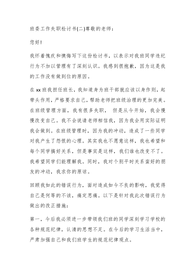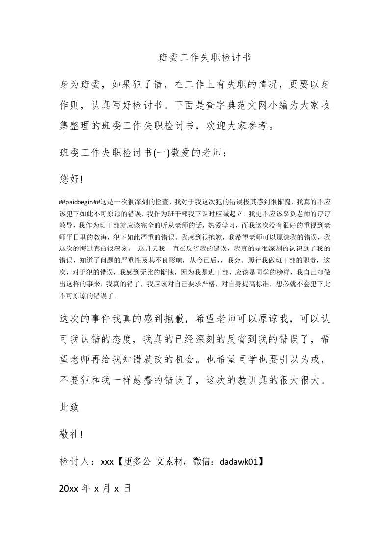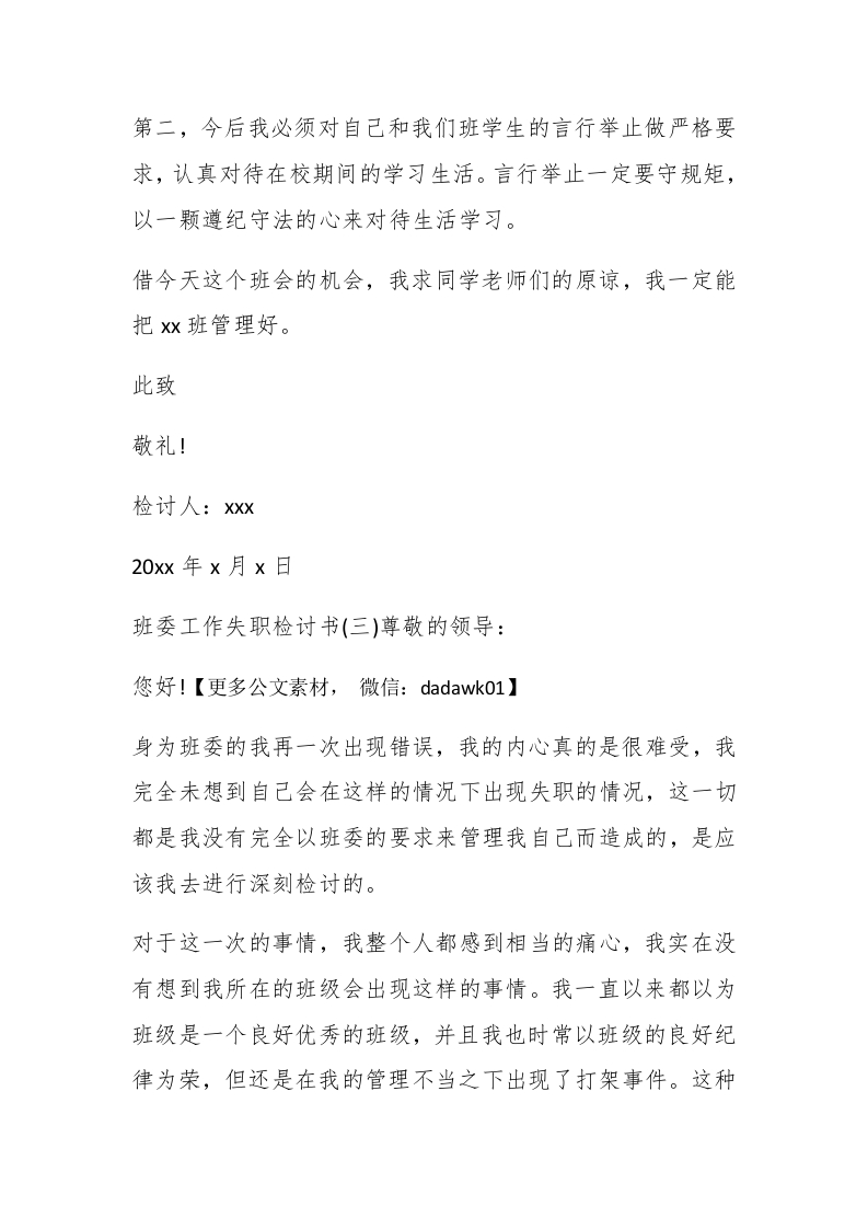班委工作失职检讨书身为班委,如果犯了错,在工作上有失职的情况,更要以身作则,认真写好检讨书。下面是查字典范文网小编为大家收集整理的班委工作失职检讨书,欢迎大家参考。班委工作失职检讨书(一)敬爱的老师:您好!榊paidbegin#这是一次很深刻的检查,我对于我这次犯的错误极其感到很惭愧,我真的不应该犯下如此不可原谅的错误,我作为班干部我下课时应喊起立。我更不应该辜负老师的谆谆教导,我作为班干部就应该完全的听从老师的话,热爱学习,而我这次没有很好的重视到老师平日里的教海,犯下如此严重的错误。我感到很抱歉,我希望老师可以原谅我的错误,我这次的悔过真的很深刻。这几天我一直在反省我的错误,我真的是很深刻的认识到了我的错误,知道了问题的严重性及其不良影响,从今己后,,我会。履行我做班干部的职责,这次,对于犯的错误,我感到无比的惭愧,因为我是班干部,应该是同学的榜样,我自己却做出这样的事来,我真的错了,我应该对自己要求严格,对自身提高标准,想必就不会犯下此不可原谅的错误了。这次的事件我真的感到抱歉,希望老师可以原谅我,可以认可我认错的态度,我真的已经深刻的反省到我的错误了,希望老师再给我知错就改的机会。也希望同学也要引以为戒,不要犯和我一样愚蠢的错误了,这次的教训真的很大很大。此致敬礼!检讨人:xxx【更多公文素材,微信:dadawko1】20xx年X月X日