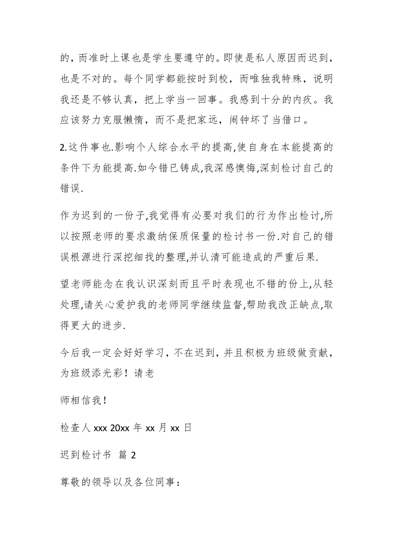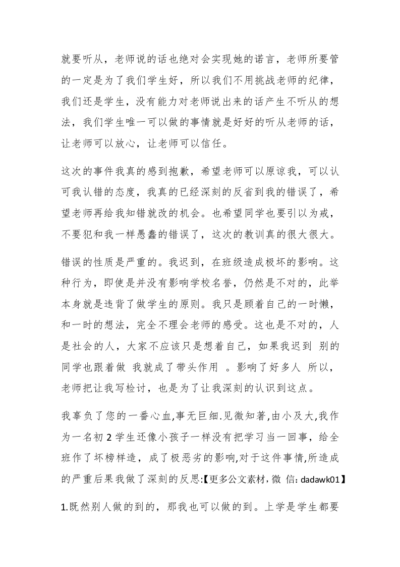迟到检讨书模板锦集7篇在学习或工作出现差错以后,避免再次犯错,要求以书面的形式,对自己的行为作出检讨,我们在写检讨书的时候要切忌找借口、推卸责任。其实很多朋友都不知道怎么写检讨书吧!下面是关于迟到检讨书7篇,仅供参考,欢迎大家阅读。迟到检讨书篇1今天,我怀着愧疚和懊悔给您写下这份检讨书,以向您表示我迟到这种行为的深刻认识以及不再迟到的决心榭paidbegin#这是一次十分深刻的检查,我对于我这次犯的错误感到很惭愧,我真的不应该迟到,我不应该违背学校的规定。我感到很抱歉,我希望老师可以原谅我的错误,我这次的悔过真的很深刻。不过,人总是会犯错误的,当然我知道也不能以此作为借口,我们还是要尽量的避免这样的错误发生,希望老师可以相信我的悔过之心。“人有失手,马有失蹄”。我的不良行为不是向学校的纪律进行挑战。绝对是失误,老师说的话很正确,就是想要犯错误也不应该再您的面前犯错误,我感到真的是很惭愧。相信老师看到我的这个态度也可以知道我对这次的事件有很深刻的悔过态度,我这样如此的重视这次的事件,希望老师可以原谅我的错误,我可以向老师保证今后一定不会迟到今天我真的是很深刻的认识到了我的错误,知道老师说的话
