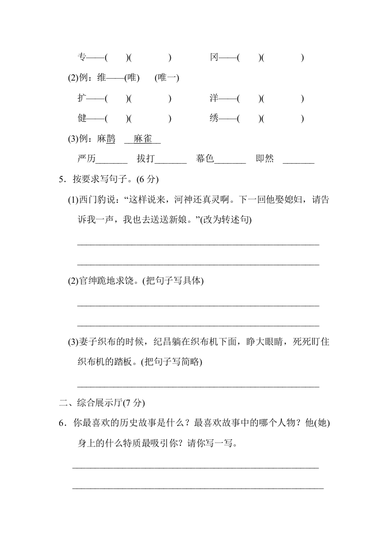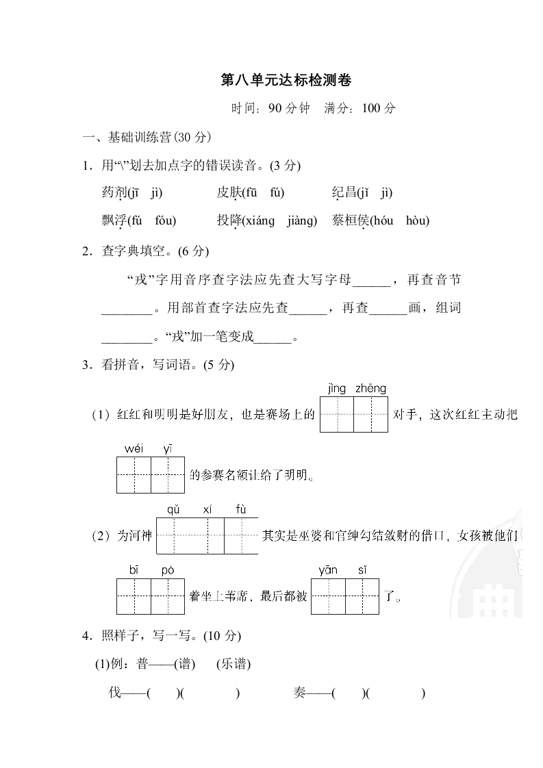第八单元达标检测卷时间:90分钟满分:100分一、基础训练营(30分)1.用”划去加点字的错误读音。(3分)药剂G位)皮肤(f位f)纪昌Gij)飘浮(ff6u)投降(xiangjiang)蔡桓侯houhòu)2.查字典填空。(6分)“戎”字用音序查字法应先查大写字母再查音节。用部首查字法应先查,再查画,组词“戎加一笔变成3.看拼音,写词语。(5分)jing zheng(1)红红和明明是好则友,也是赛场上的对手,这次红红主动把weiyi的参赛名额让给了明明。quxifù(2)为河神其实是巫婆和官绅勾结敛财的借口,女孩被他们bipoyansi着坐上苇席,最后都被4.照样子,写一写。(10分)(1)例:普(谱)(乐谱)伐—()(奏((
