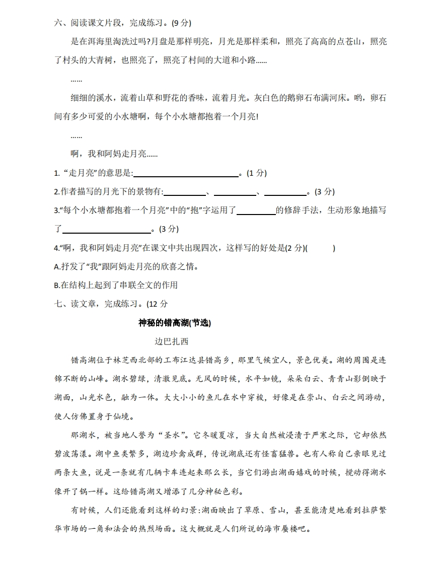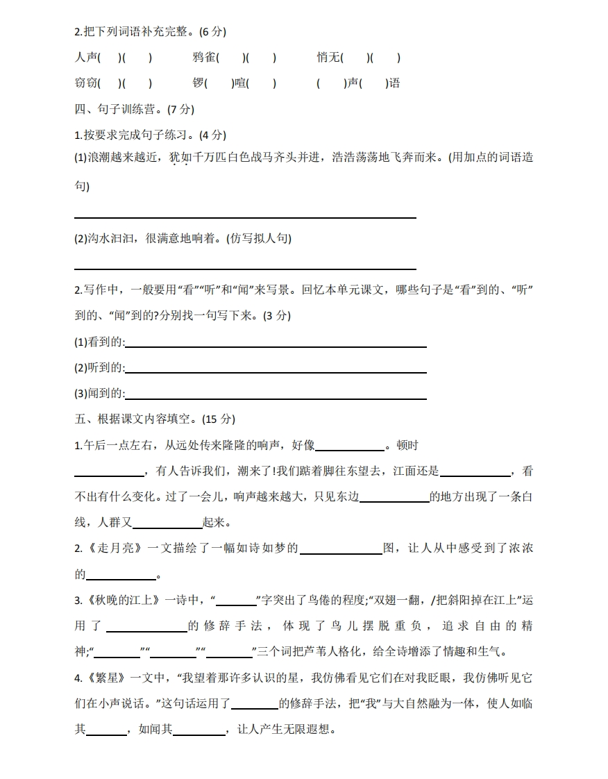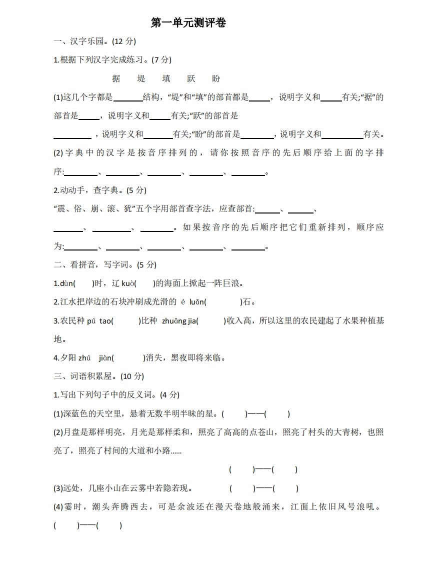 第一单元测评卷一、汉字乐园。(12分)1.根据下列汉字完成练习。(7分)】据堤填跃盼(1)这几个字都是结构,“堤“和“填”的部首都是」,说明字义和有关;“据”的部首是一,说明字义和有关;“跃”的部首是,说明字义和有关;“盼”的部首是,说明字义和有关。(2)字典中的汉字是按音序排列的,请你按照音序的先后顺序给上面的字排序:2.动动手,查字典。(5分)“震、俗、崩、滚、犹”五个字用部首查字法,应查部首:一如果按音序的先后顺序把它们重新排列,顺序应为:二、看拼音,写字词。(5分)1.dun()时,辽kuò()的海面上掀起一阵巨浪。2.江水把岸边的石块冲刷成光滑的éluǎn()石。3.农民种pútao()比种zhuang jia()收入高,所以这里的农民建起了水果种植基地。4.夕阳zhújiàn()消失,黑夜即将来临。三、词语积累屋。(10分)1.写出下列句子中的反义词。(4分)】(1)深蓝色的天空里,悬着无数半明半昧的星。()一((2)月盘是那样明亮,月光是那样柔和,照亮了高高的点苍山,照亮了村头的大青树,也照亮了,照亮了村间的大道和小路(3)远处,几座小山在云雾中若隐若现。(4)霎时,潮头奔腾西去,可是余波还在漫天卷地般涌来,江面上依旧风号浪吼。()一一()