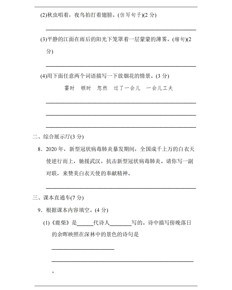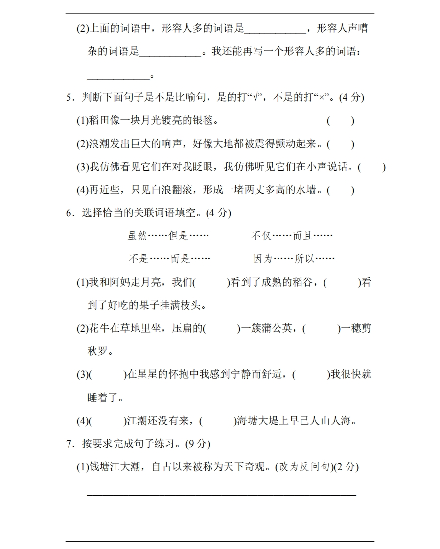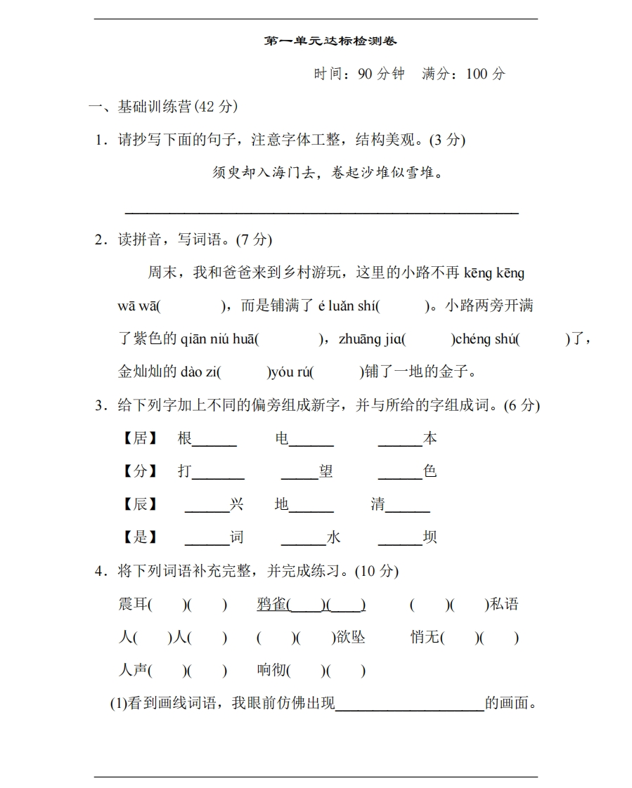 第一单元达标检测卷时间:90分钟满分:100分一、基础训练营(42分)1.请抄写下面的句子,注意字体工整,结构美观。(3分)须臾却入海门去,卷起沙堆似雪堆。2.读拼音,写词语。(7分)周末,我和爸爸来到乡村游玩,这里的小路不再kengkengwa wa(),而是铺满了e luan shi()。小路两旁开满了紫色的qian nitúhua()zhuang jia()cheng shu()了,金灿灿的dao zi()you ru()铺了一地的金子。3.给下列字加上不同的偏旁组成新字,并与所给的字组成词。(6分)【居】根电本【分】打望色【辰】兴地清【是】词水坝4.将下列词语补充完整,并完成练习。(10分)震耳()()鸦雀()〔)()()私语人()人(()()欲坠悄无()人声(响彻()((1)看到画线词语,我眼前仿佛出现的画面。