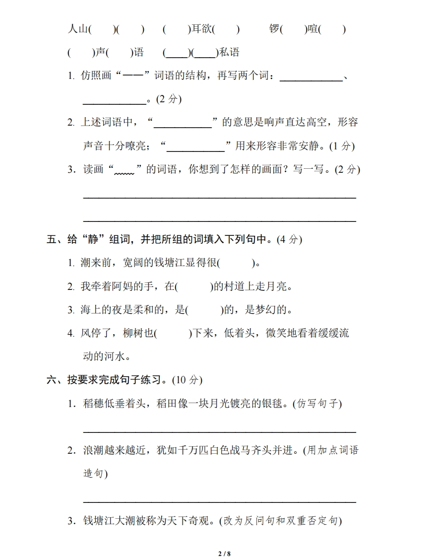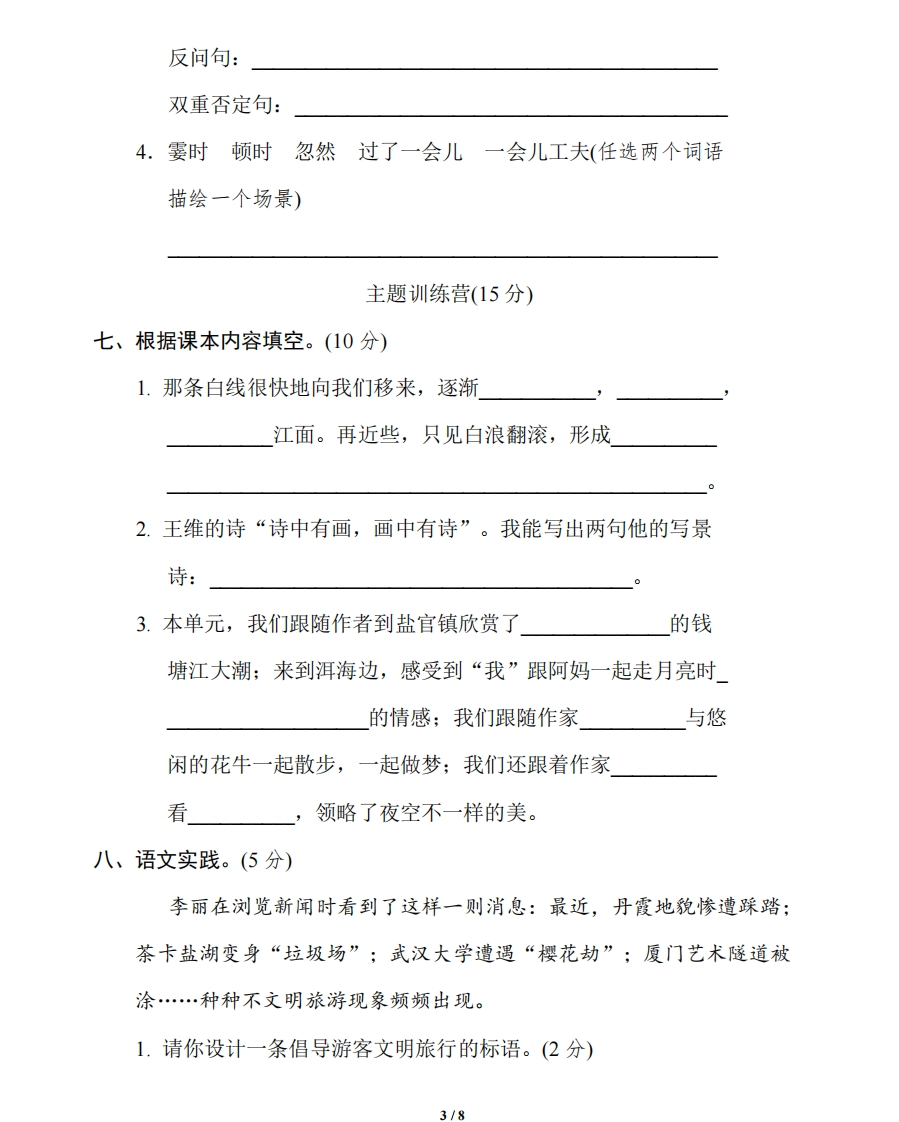 第一单元达标检测卷基础百花园(41分)一、用“√”给加点字选择正确的读音。(3分)》1.在风号(hao hao)浪吼的江面上,他独自一人站在船头,唱着船工号(hao hao)子。2.归巢的鸟儿,尽(jinjin)管是倦了,还是拼尽(jin jin)全力向家飞去。3.夏夜,屋里太闷(mnmn)热了。突然,外面响起了闷(mnmen)雷。二、读拼音,写词语。(8分)zhúiianfeng súyubōkuan kuopútaogǔndòngshàshigian shǒu三、给下面加点字选择正确的解释,并将序号填在括号里。(3分)【俗】①社会上长期形成的风气、习惯、礼仪等;②大众的,普遍流行的;③平庸的,低级趣味的。1.他素质不高,言谈粗俗。()2.收庄稼前,要把道路修一修,补一补,这是村里的风俗。()》3.有一种昆虫学名叫“桑褐刺蛾”,俗称洋辣子”。四、将下列词语补充完整,并完成练习。(13分)》)彻()霄()()卷地(()无声118