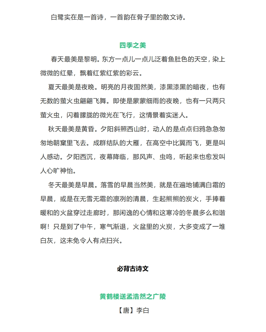 必背课文白鹭白鹭是一首精巧的诗。色素的配合,身段的大小,一切都很适宜。白鹤太大而嫌生硬,即使如粉红的朱鹭或灰色的苍鹭,也觉得大了一些,而且太不寻常了。然而白鹭却因为它的常见,而被人忘却了它的美。那雪白的蓑毛,那全身的流线型结构,那铁色的长喙,那青色的脚,增之一分则嫌长,减之一分则嫌短,素之一忽则嫌白,黛之一忽则嫌黑。在清水田里,时有一只两只白鹭站着钓鱼,整个的田便成了一幅嵌在琉璃框里的画面。田的大小好像是有心人为白鹭设计出的镜匣。晴天的清晨,每每看见它孤独地站立于小树的绝顶,看来像不安稳,而它却很悠然。这是别的鸟很难表现的一种嗜好。人们说它是在望哨,可它真是在望哨吗?黄昏的空中偶见白鹭的低飞,更是乡居生活中的一种恩惠。那是清澄的形象化,而且具有了生命了。或许有人会感到美中不足,白鹭不会唱歌。但是白鹭的本身不就是一首很优美的歌吗?一不,歌未免太铿锵了。