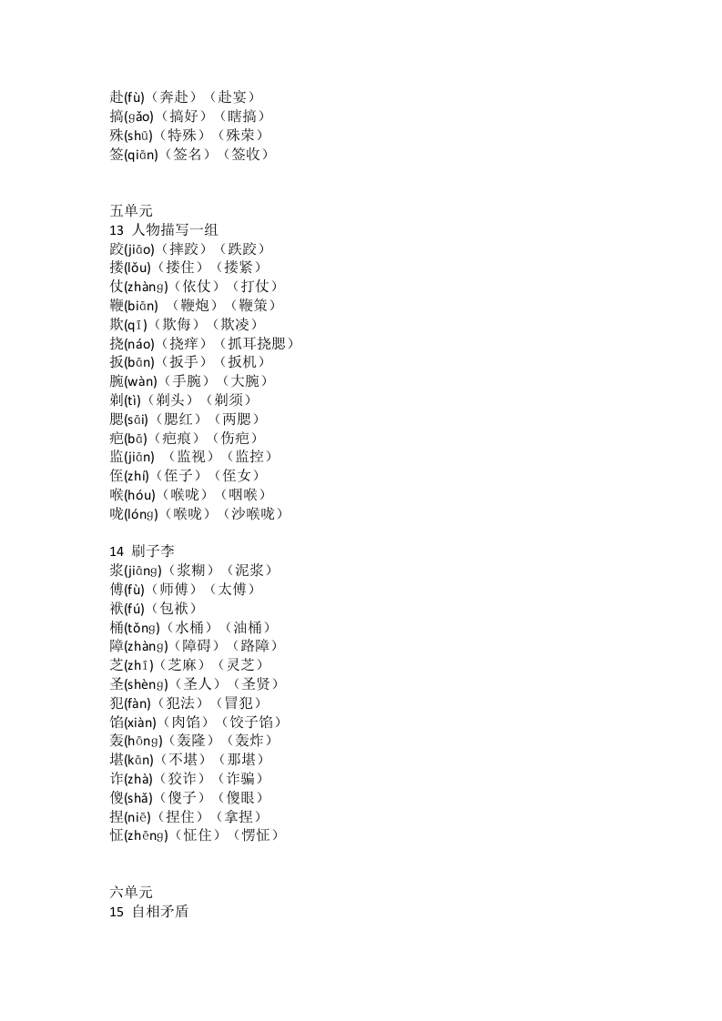 部编语文五年级下册生字组词一单元1古诗三首昼(zhu)(白昼)(昼夜)耘yin)(耕耘)(耘田)桑(sang)(桑树)(桑叶)晓xio)(知晓)(晓得)2祖父的园子蝴hú)(蝴蝶)蝶(die)(蝴蝶)(蝶飞)蚂(ma)(蚂蚱)蚱(zha)(蚱蜢)樱ying)(樱桃)(樱花)拔(b)(拔牙)(拔草)瞎xiā)(瞎说)(瞎子)铲(chan)(铲子)(铲平)割(g)(割草)(收割)承(cheng)(承载)(承认)拴shuan)(拴牛)(拴住)瓢(pio)(瓢泼)(水瓢)逛(guang)(逛街)(闲逛)二单元5草船借箭妒(dù)(妒忌)忌()(妒忌)(忌讳)曹(cao)(市曹)(兵曹)督(d)(督促)(都督)委(wě1)(委屈)(委员)惩(cheng)(惩罚)(严惩)鲁ǔ)(鲁莽)(粗鲁)遮(zhe)(遮住)(遮挡)私(s1)(无私)(自私)寨(zha)(村寨)(山寨)擂(lèi)(擂鼓)(打擂)呐n)(呐喊)(唢呐)插(cha)(插曲)(插秧)6景阳冈冈(gang)(山冈)(高冈)饥(1)(饥饿)(饥寒)恰(qi)(恰好)(恰切)府f)(政府)(官府)榜bng)(榜文)(光荣榜)