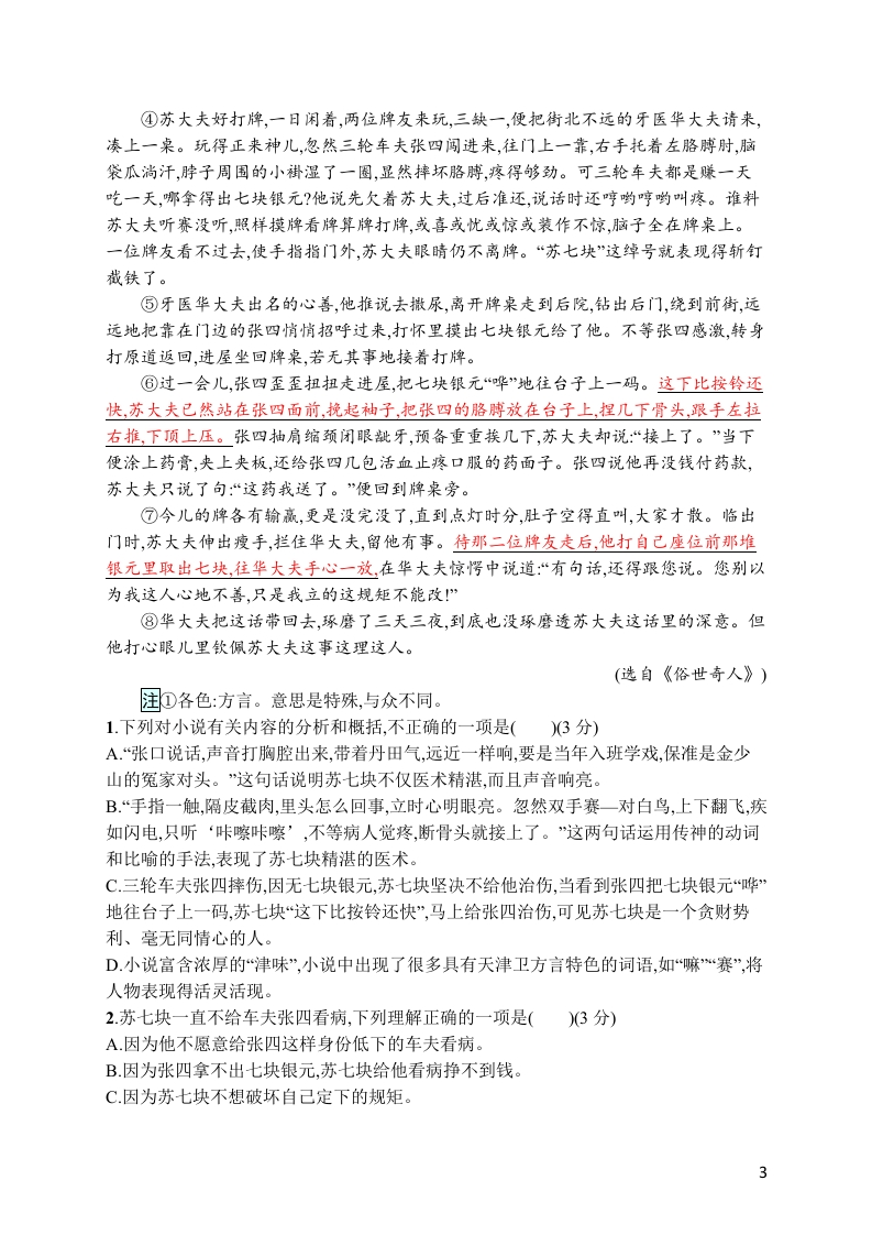 第五单元评价测试卷(时间:80分钟满分:100分)题号总分得分一、积累与运用(36分)1.读拼音,写词语。(5分)shifusuai jicolingzhiPàitouxianjie2.下列加点字的注音有误的一项是()3分)A.刷浆(jiang)发怔(zheng)扳倒(ban)B.监生Gian)脚腕(wan)揩泪(kai)C.使诈(zha)屏障(ping)难堪(kan)D.露馅儿(xian)侄子(zh伤疤(ba)3.下列词语书写有误的一项是()3分)A.欺负语重心长半信半疑B.郎中天衣无缝诸亲六眷C.格局仰面朝天结实硬捧D.可怜匀匀实实平平整整4.在下面句子中的括号里填入词语,最恰当的一项是()3分)江姐遭受酷刑,已经奄奄一息,但她仍然()地对敌人说:“你们休想从我口里得到任何东西。”A.半信半疑B.斩钉截铁C.兴高采烈D.一丝不苟5.下列不是描写人物外貌的词语是()3分)A.神采飞扬B.衣冠楚楚C.膀大腰粗D.仪表堂堂6.对下列句子运用的描写方法判断有误的一项是()3分)A.他面色凝重地坐在窗前。(神态描写)B.如果举了手,王老师会喊我吗?课后李悦会不会嘲笑我?(心理描写)C.一双丹凤三角眼,两弯柳叶吊梢眉。(外貌描写)D.他把两眼睁的的溜圆,把头又狠狠摇了几摇,越发指得紧了。(神态描写)7.对下面语段的主要意思概括正确的一项是()3分)他一身青布长衫,洗得发了白,洁净中透着皂角的气味。连那双靴子的样式也没有任何特别之处。朴素的穿着与他著名的身份仿佛丝毫不相符。A.他的穿着很旧。B.他的穿着很干净。C.他的穿着很朴素。D.他的穿着与身份不相符。8.在下面语段中的括号里填入表示动作的词,最合适的一项是()3分)