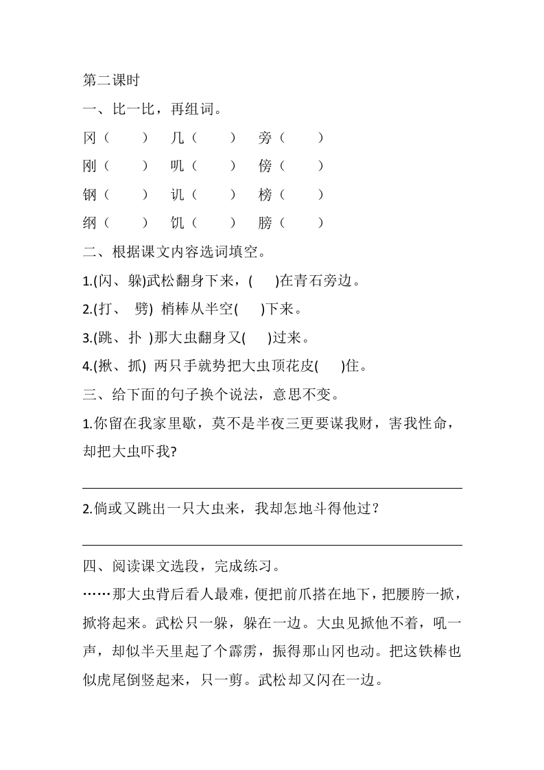 6景阳冈课时练第一课时一、读拼音,写词语。王五又江()又渴,便走进路边茶馆。茶馆里人人议论官f()张贴的bǎng()文一一因为有大虫,所以行人不得独自过景阳gang()。王五想,要是有壮士能赤手空quan()打死老虎,就好了。二、填上恰当的关联词。1.酒家道:“我家的酒()是村里的酒,(比得上老酒的滋味。”2.酒家()说()摇着头,走进店里去了。三、把下面句子中加点的词语换成和它意思相近的词语。1.酒家给武松筛了满满一碗酒。()2.你如何不肯卖酒与我吃?(3这时候天快晚了,你还过冈,枉送了自家性命?()4.请勿自误。()四、按课文内容填空。本文重点讲了武松()和()这两个故事情节,分别可以看出武松()和)的性格特点。