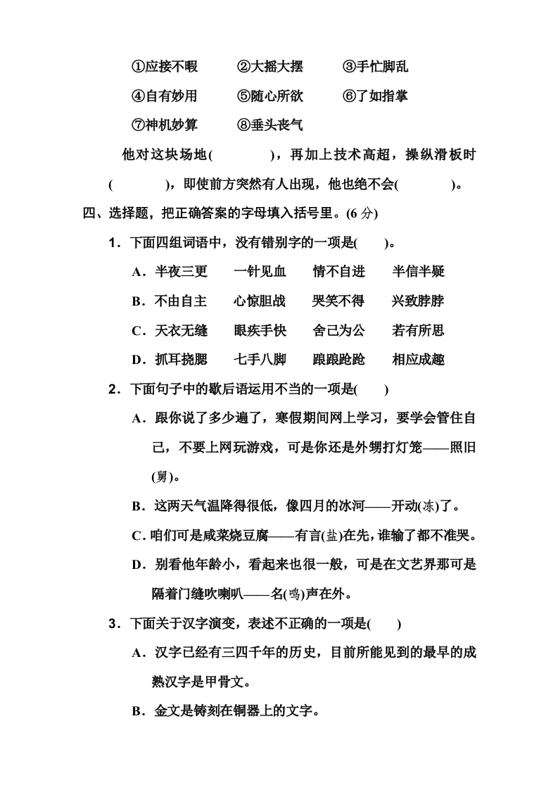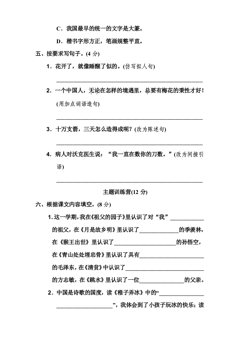 部编版五年级语文下册期末模拟试卷(一)时间:90分钟满分:100分基础百花园(29分)一、读句子,看拼音,写词语。(7分)1.我们祖国的领土是shen shèng()不可qIn fan(的。王继才、王仕花夫妇守岛卫国32年,他们的精神令我们sùran qi jing()。2.乡间生活chéngzài()了我许多美好的记忆。在花丛间追qIng ting()、捉húdié(),在草地上逮mazha)…二、给加点字选择正确的读音,打上“√”。(6分)1.在寒风中,很多花的花枝都折(zhésh)了,但梅花还是挺直腰杆,绝不低头折(zhéshé)节。2.店里的伙计上下打量(1 iang liang).了他一下,就摆出一副尖酸刻薄(b6báo)的嘴脸来。3.小嘎子已有些沉不住气,刚想用脚腕(wan wan)子去钩他的腿,不料反给他把脚别(biébiè)住了。三、按要求完成练习。(6分)1.用4”划去句中括号里不正确的字。(3分)他驾着车在公路上飞(驰弛)。一块巨石(睹堵)在路中间,使他无法前行。他既想(固雇)人移开石头,又想等待救援队。2.选择恰当的成语填在下面句子的括号里。(填序号,3分)