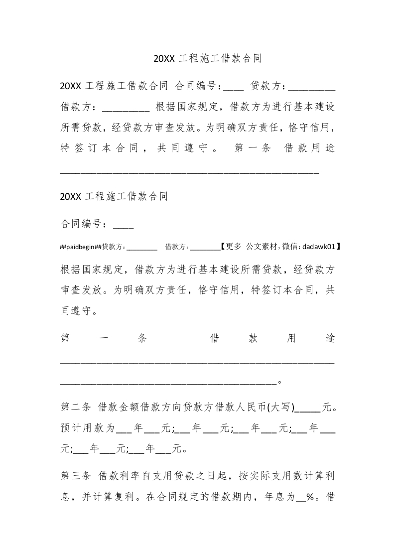 20XX工程施工借款合同20XX工程施工借款合同合同编号:贷款方:借款方:根据国家规定,借款方为进行基本建设所需贷款,经贷款方审查发放。为明确双方责任,恪守信用,特签订本合同,共同遵守。第一条借款用途20XX工程施工借款合同合同编号:#paidbegin#贷款方:_借款方:」【更多公文素材,微信:dadawko1】根据国家规定,借款方为进行基本建设所需贷款,经贷款方审查发放。为明确双方责任,恪守信用,特签订本合同,共同遵守。第条借款用途第二条借款金额借款方向贷款方借款人民币(大写)元。预计用款为一年一一元;一年一一元;一年一一元;一年一元;年元;一年_元。第三条借款利率自支用贷款之日起,按实际支用数计算利息,并计算复利。在合同规定的借款期内,年息为%。借