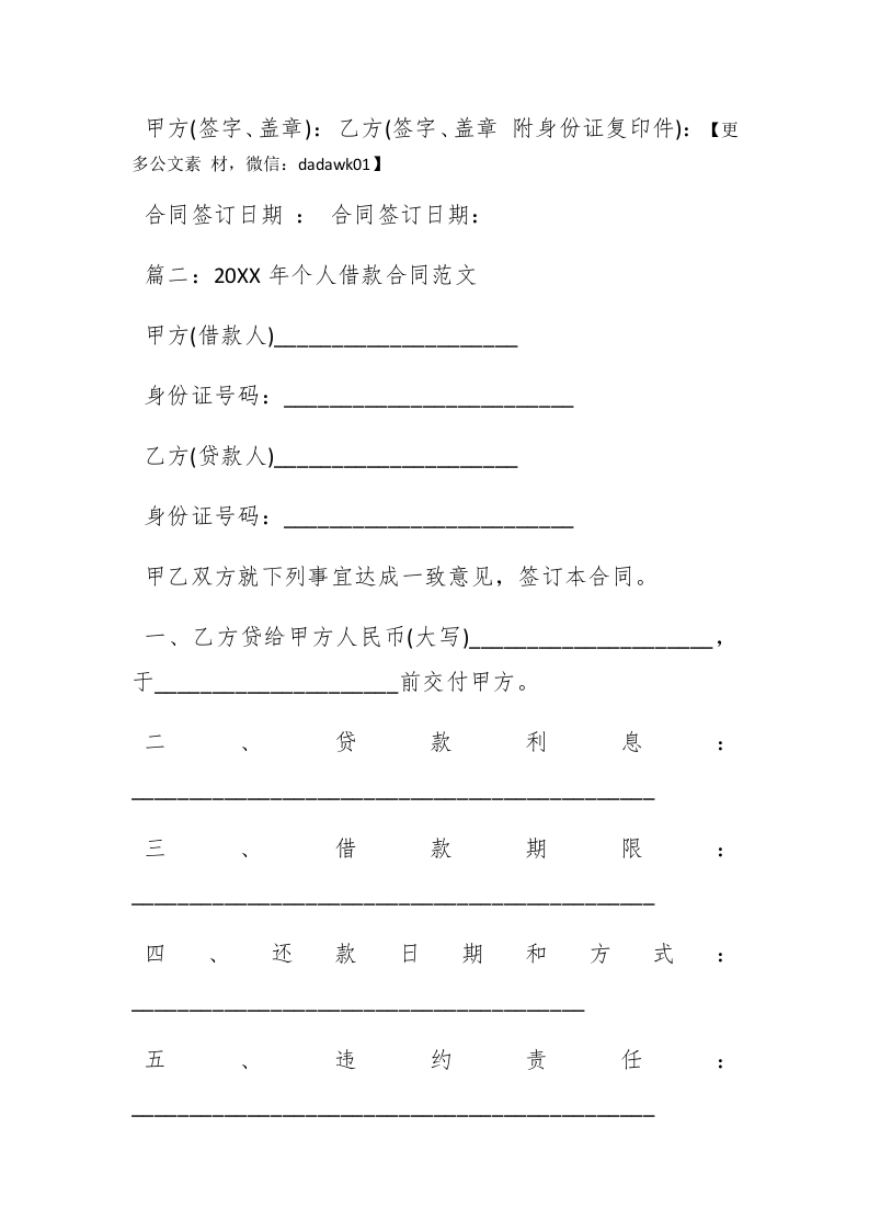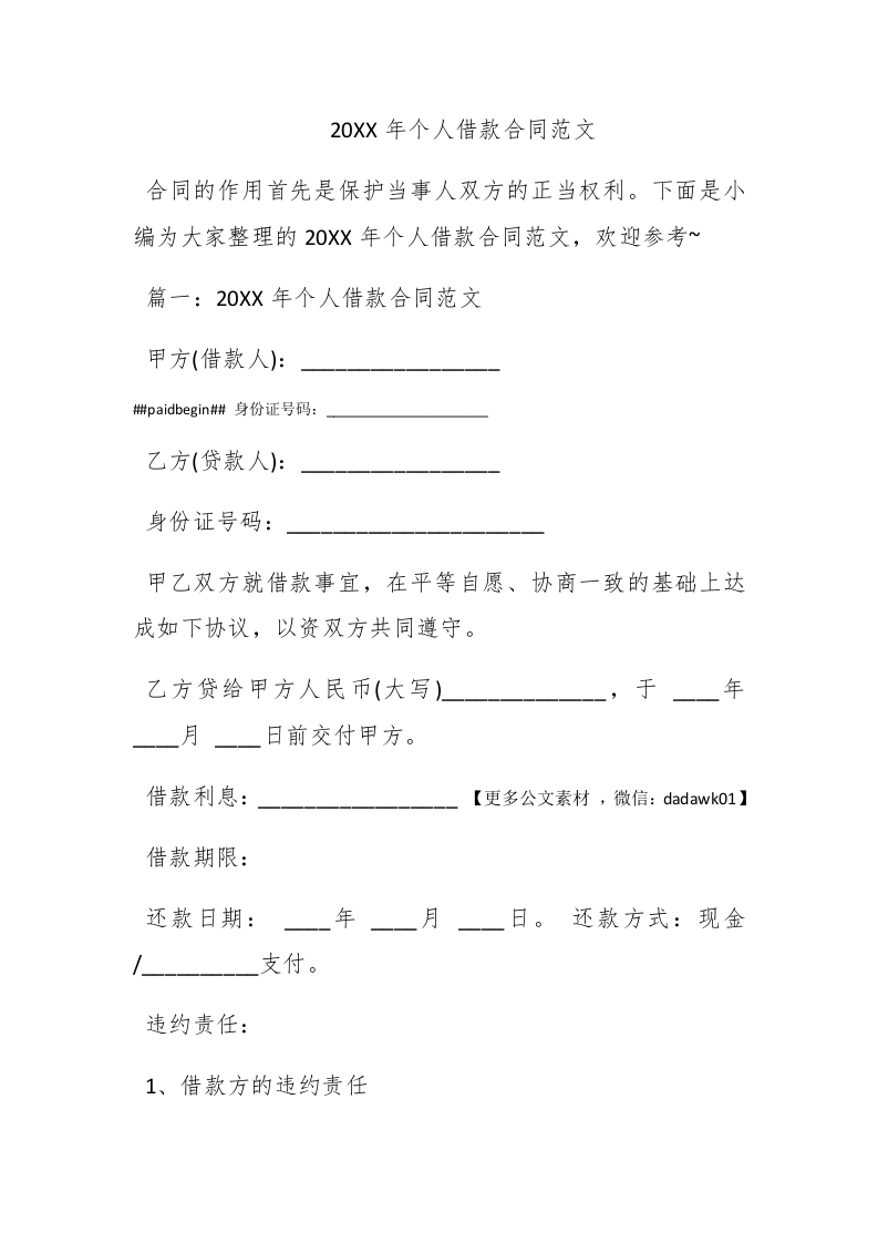 20XX年个人借款合同范文合同的作用首先是保护当事人双方的正当权利。下面是小编为大家整理的20XX年个人借款合同范文,欢迎参考~篇一:20XX年个人借款合同范文甲方(借款人):带paidbegin#身份证号码:乙方(贷款人):身份证号码:甲乙双方就借款事宜,在平等自愿、协商一致的基础上达成如下协议,以资双方共同遵守。乙方贷给甲方人民币(大写)】于年日前交付甲方。月借款利息:【更多公文素材,微信:dadawk01】借款期限:还款日期:年月一日。还款方式:现金支付。违约责任:1、借款方的违约责任