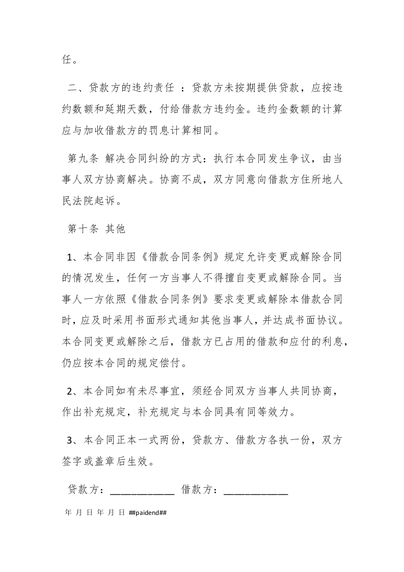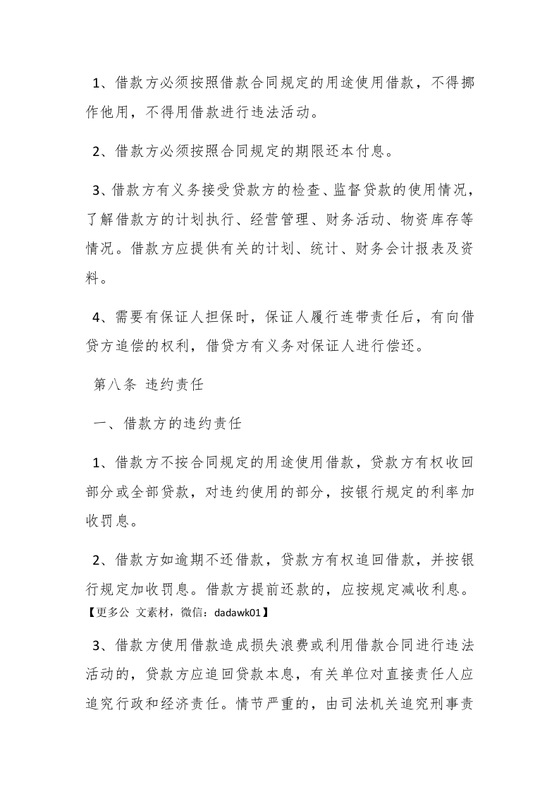 20XX年民间借款合同范本合同(或合约)(covenants),是双方当事人基于对立合致的意思表示而成立的法律行为,为私法自治的主要表现,意指盖印合约中所包含的合法有效承诺或保证。本文是关于20XX年民间借款合同范本,仅供大家参考。贷款方:借款方:排paidbegin#借款方为进行生产(或经营活动),向贷款方申请借款,贷款方业己审查批准,经双方协商,特订立本合同,以便共同遵守。第一条贷款种类第二条借款用途第三条借款金额人民币(大写)元整。第四条借款利率:借款利息,如遇国家调整利率,按新规定计算。第五条借款和还款期限第六条还款资金来源及还款方式1、还款资金来源:2、还款方式:第七条保证条款【更多公文素材,微信:dadawk01】