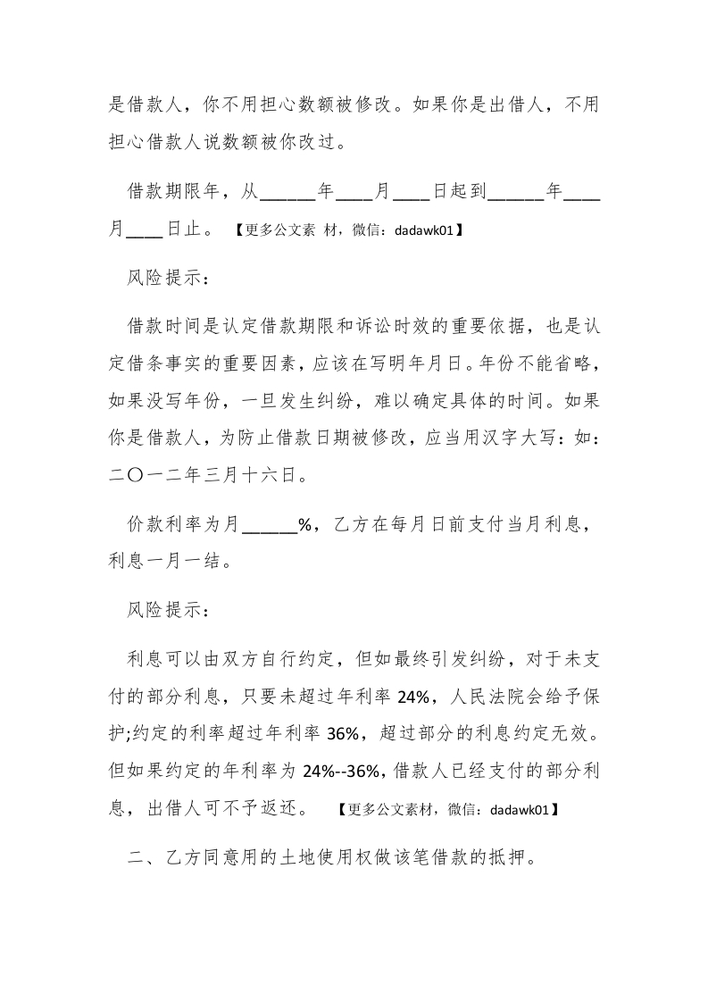 20XX最新土地抵押借款合同范本甲方:(贷款人)身份证号:住所:#paidbegin#乙方:(借款人)身份证号:住所:风险提示:借款、还款都必须注意保存好相关的书面证据。一般而言,欠条或者借条在债务人之手时,可能将被推定为该债务已经清偿。原告主张债权时,如无法提供书面借据的,应提供必要的事实根据或与自己无利害关系的两人以上的证人证言,来支持自己的主张。兹因土地抵押借款事宜,经双方同意订立各条款如下:一、甲方于年月日向乙方借款元。风险提示:借款数额肯定要写的,大家也都会写,只是要注意数额应该用大写,并标上币种。在大写的旁边再附注小写,并写上小数点。这样做主要是防止数额被更改。写清楚了,如果你