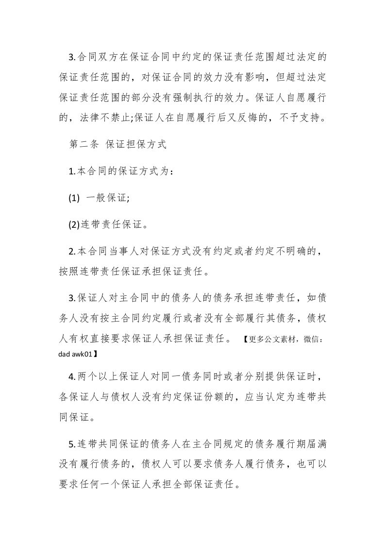 20XX最新担保借款合同范本担保借款是指有一定的担保人作保证或利用一定的财产作抵押或质押而取得的借款。以下是一份20XX最新担保借款合同范本,仅供参考!20XX最新担保借款合同范本保证人:法定代表人:职务:#paidbegin#债权人:法定代表人:职务:【更多公文素材,微信:d adawko1】为确保合同(以下称主合同)的履行,在债务人不履行债务时,保证人愿意按照约定履行债务或者承担责任,债权人经审查,同意接受作为保证人,双方经协商一致,按以下条款订立本合同。第一条保证担保的范围1.保证担保的范围包括:主债权及利息、债务人应支付的违约金(包括罚息)和损害赔偿金以及实现债权的费用(包括诉讼费、律师费等)被保证的主债权种类、数额:【更多公文素材,微信:dadawk01】2.合同双方对保证担保的范围没有约定或者约定不明确的,保证人应当对全部债务承担责任。