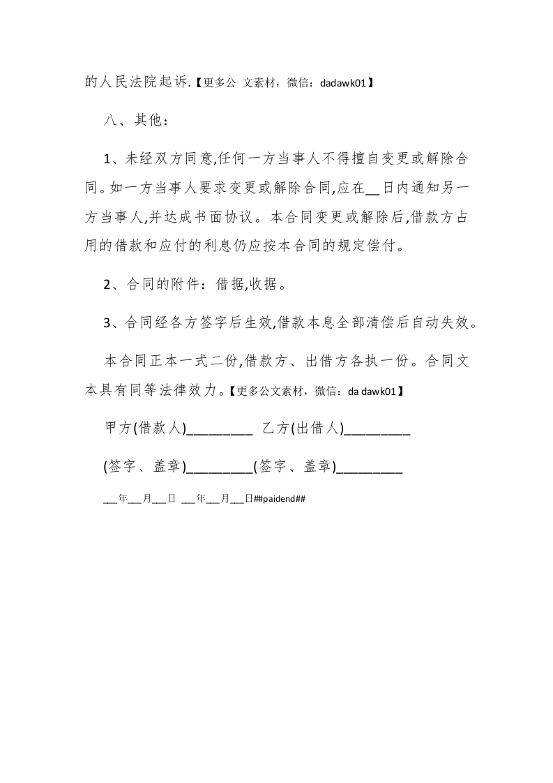 20XX民间个人借款合同简单范例精选欣赏查字典范文网小编特意为大家整理准备20XX民间个人借款合同简单范例精选欣赏,希望内容对您有参考价值。甲方(出借人)】身份证号码:乙方(借款人)身份证号码:榭paidbegin#为了明确责任,恪守信用,在双方自愿、协商情况下特签订本合同以资共同信守。一、借款金额:(大写)】二、借款用途:借款人因需要,急需一笔资金。三、借款利率:一按年收息,利随本清。四、借款期限:借款时间自年月日起至一年一月日止。五、还款日期和方式:六、违约责任:借款方应按合同规定的时间还款。如借款方不按期偿还借款,出借方有权限期追回借款,并按合同规定%计算加收逾期利息。七、争议解决方式:协商解决,协商不成,可以向甲方所在