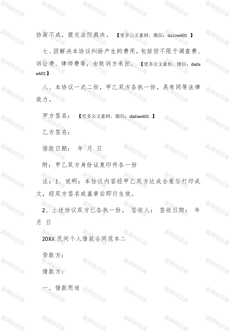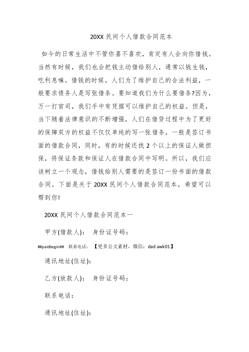 20XX民间个人借款合同范本如今的日常生活中不管你喜不喜欢,肯定有人会向你借钱。当然有时候,我们也会把钱主动借给别人,通常以钱生钱,吃利息嘛。借钱的时候,人们为了维护自己的合法利益,一般要求债务人是写张借条。要知道我们为什么要借条?因为,万一打官司,我们手中有凭据可以维护自己的权益。但是,当下随着法律意识的不断增强,人们在借贷过程中为了更好的保障双方的权益不仅仅单纯的写一张借条,一般是签订书面的借款合同,同时,有的时候还找2个以上的保证人做担保,将保证条款和保证人在借款合同中写明。所以,我们应该树立一个观念,借钱给别人需要的是签订一份书面的借款合同。下面是关于20XX民间个人借款合同范本,希望可以帮到你!20XX民间个人借款合同范本一甲方(借款人):身份证号码:糊paidbegin#联系电话:【更多公文素材,微信:dad awko1】通讯地址(住址):乙方(放款人):身份证号码:联系电话:通讯地址(住址):
