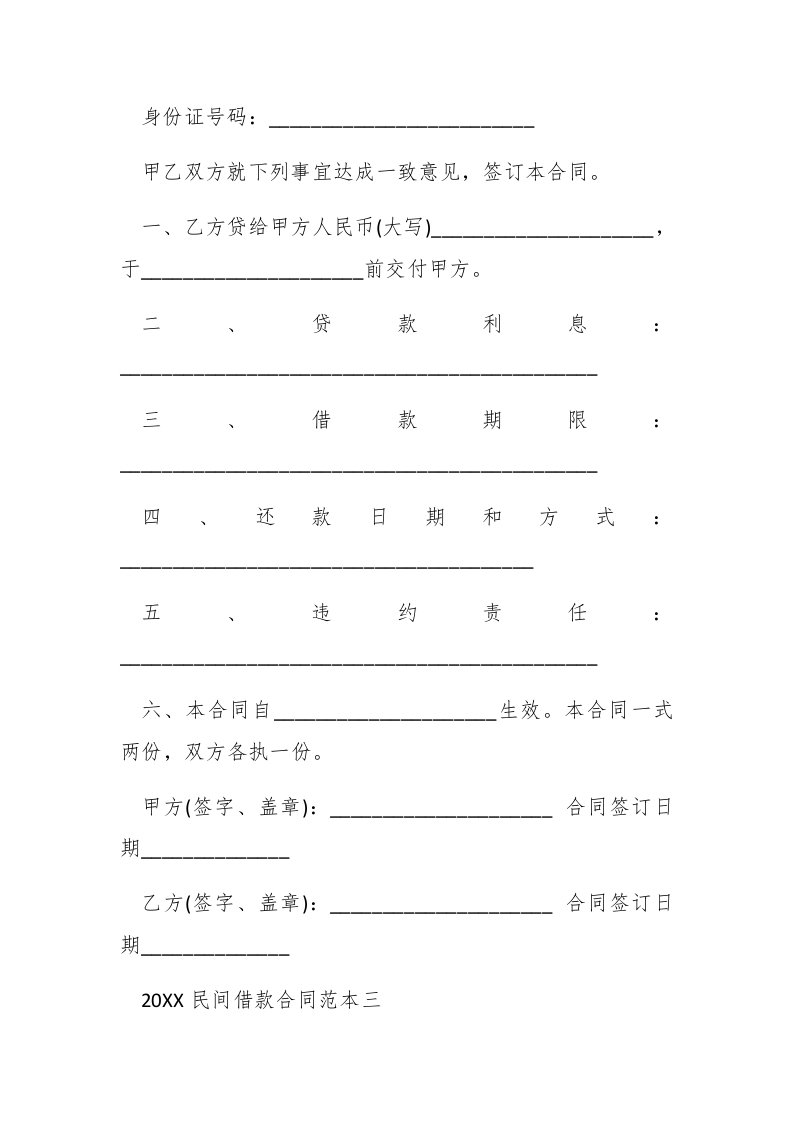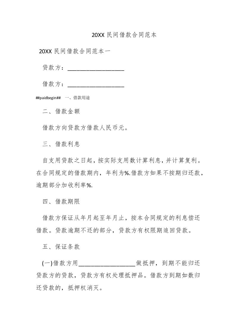 20XX民间借款合同范本20XX民间借款合同范本一贷款方:借款方:擗paidbegin#一、借款用途二、借款金额借款方向贷款方借款人民币元。三、借款利息自支用贷款之日起,按实际支用数计算利息,并计算复利。在合同规定的借款期内,年利为%.借款方如果不按期归还款,逾期部分加收利率%.四、借款期限借款方保证从年月起至年月止,按本合同规定的利息偿还借款。贷款逾期不还的部分,贷款方有权限期追回贷款。五、保证条款(一)借款方用做抵押,到期不能归还贷款方的贷款,贷款方有权处理抵押品。借款方到期如数归还贷款的,抵押权消灭。