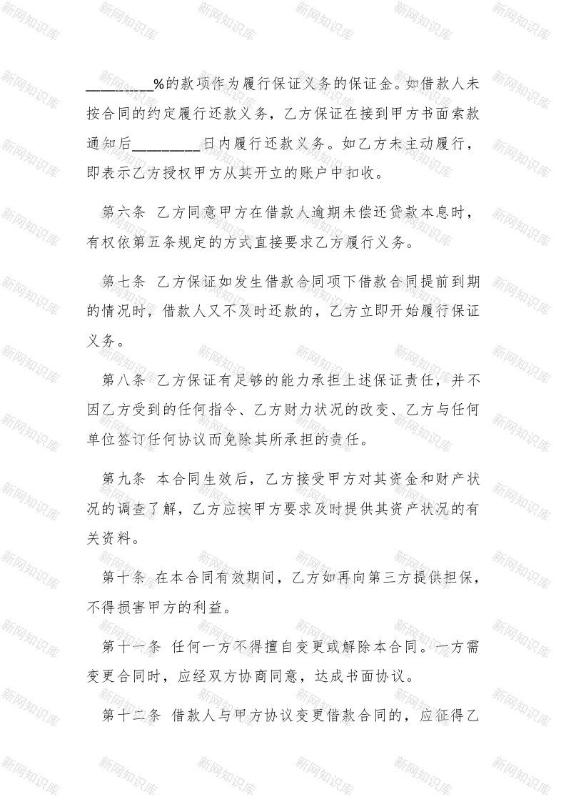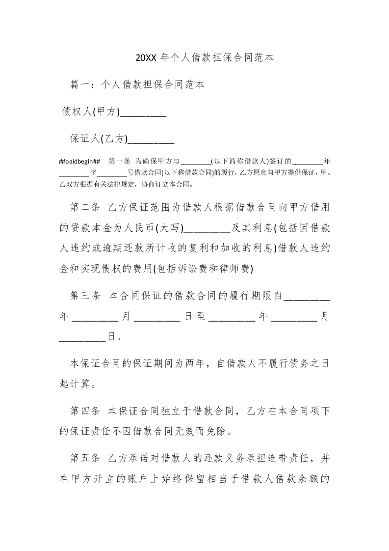 20XX年个人借款担保合同范本篇一:个人借款担保合同范本债权人(甲方)】保证人(乙方)】描paidbegin#第一条为确保甲方与_(以下简称借款人)签订的」年字号借款合同(以下称借款合同)的履行,乙方愿意向甲方提供保证,甲、乙双方根据有关法律规定,协商订立本合同。第二条乙方保证范围为借款人根据借款合同向甲方借用的贷款本金为人民币(大写)】及其利息(包括因借款人违约或逾期还款所计收的复利和加收的利息)借款人违约金和实现债权的费用(包括诉讼费和律师费)第三条本合同保证的借款合同的履行期限自年月日至年月本保证合同的保证期间为两年,自借款人不履行债务之日起计算。第四条本保证合同独立于借款合同,乙方在本合同项下的保证责任不因借款合同无效而免除。第五条乙方承诺对借款人的还款义务承担连带责任,并在甲方开立的账户上始终保留相当于借款人借款余额的