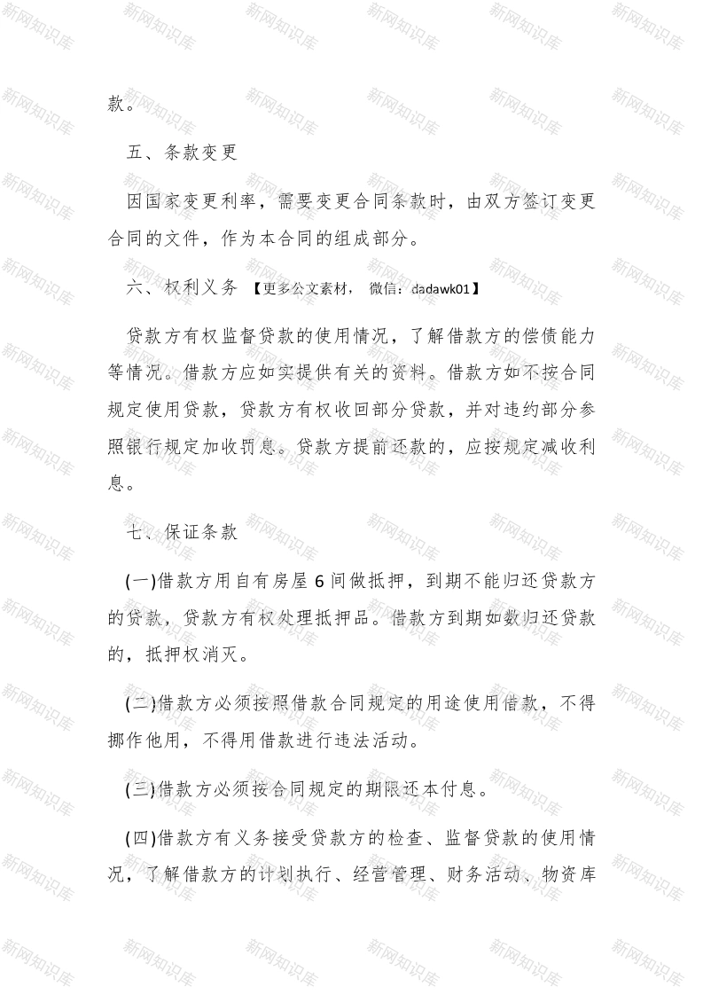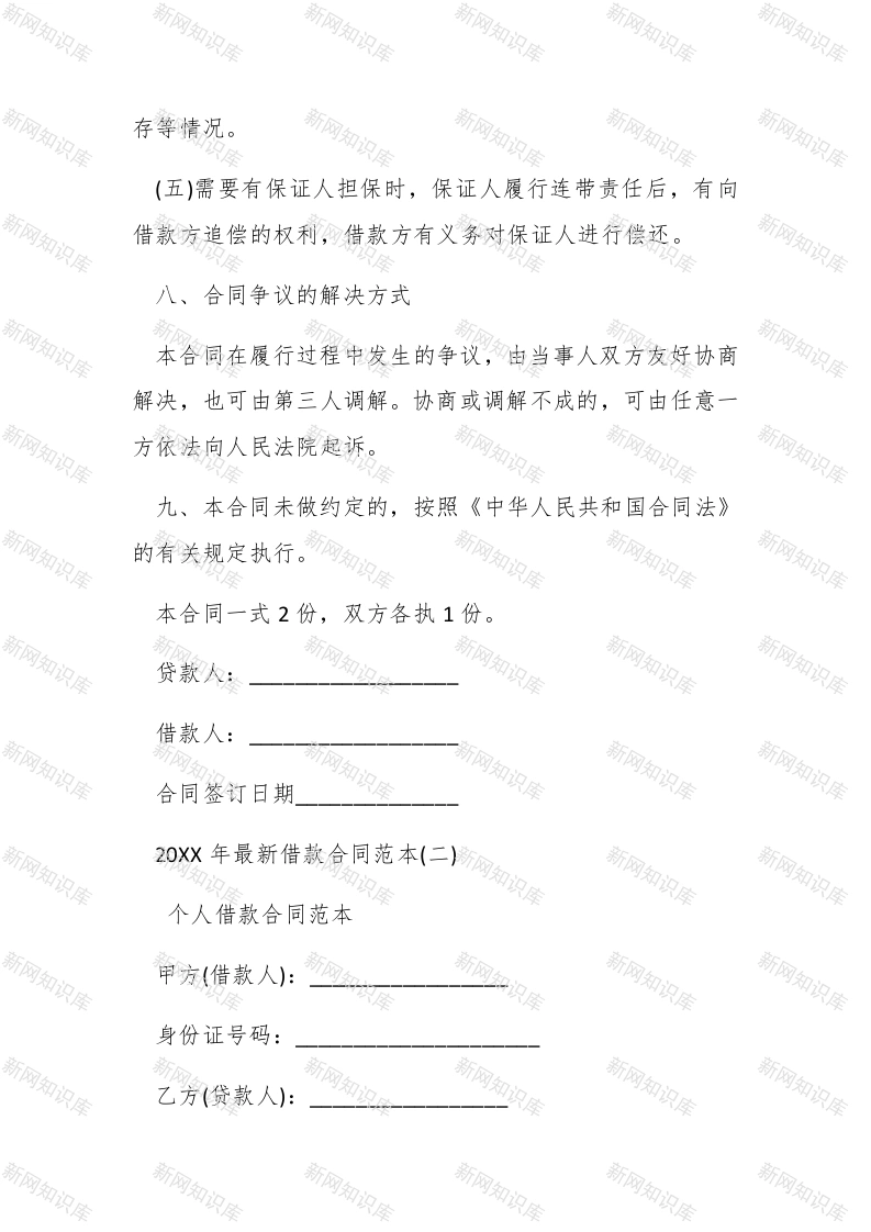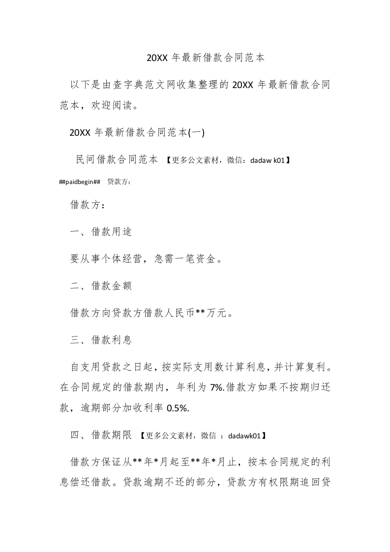 20XX年最新借款合同范本以下是由查字典范文网收集整理的20XX年最新借款合同范本,欢迎阅读。20XX年最新借款合同范本(一)】民间借款合同范本【更多公文素材,微信:dadaw ko1】#paidbegin#贷款方:借款方:一、借款用途要从事个体经营,急需一笔资金。二、借款金额借款方向贷款方借款人民币**万元。三、借款利息自支用贷款之日起,按实际支用数计算利息,并计算复利。在合同规定的借款期内,年利为7%借款方如果不按期归还款,逾期部分加收利率0.5%.四、借款期限【更多公文素材,微信:dadawk01】借款方保证从*年*月起至**年*月止,按本合同规定的利息偿还借款。贷款逾期不还的部分,贷款方有权限期追回贷