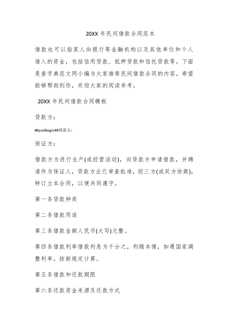 20XX年民间借款合同范本借款也可以指某人向银行等金融机构以及其他单位和个人借入的资金,包括信用贷款、抵押贷款和信托贷款等。下面是查字典范文网小编为大家推荐民间借款合同的内容,希望能够帮助到你,欢迎大家的阅读参考。20XX年民间借款合同模板贷款方:#paidbegin#借款方:保证方:借款方为进行生产(或经营活动),向贷款方申请借款,并聘请作为保证人,贷款方业已审查批准,经三方(或双方协商),特订立本合同,以便共同遵守。第一条贷款种类第二条借款用途第三条借款金额人民币(大写)元整。第四条借款利率借款利息为千分之,利随本情,如遇国家调整利率,按新规定计算。第五条借款和还款期限第六条还款资金来源及还款方式