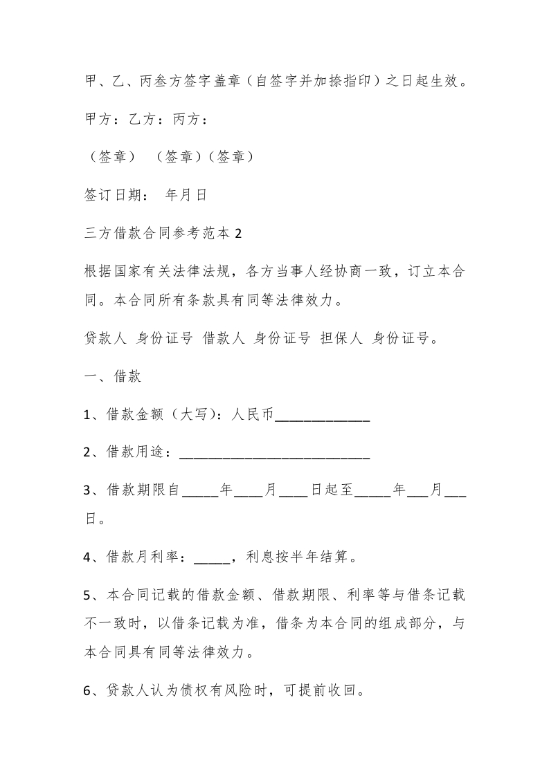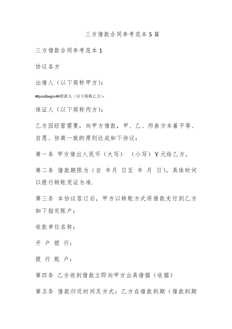 三方借款合同参考范本5篇三方借款合同参考范本1协议各方出借人(以下简称甲方):#paidbegin#借款人(以下简称乙方):保证人(以下简称丙方):乙方因经营需要,向甲方借款,甲、乙、丙叁方本着平等、自愿、协商一致的原则达成如下协议:第一条甲方借出人民币(大写)(小写)¥元给乙方。第二条借款期限为(自年月日至年月日)。具体时间以银行转账凭证为准.第三条本协议签订后,甲方以转账方式将借款支付到乙方如下指定账户:收款单位名称:开户银行:银行账户:第四条乙方收到借款立即向甲方出具借据(收据)第五条借款归还时间及方式:乙方在借款到期(借款到期