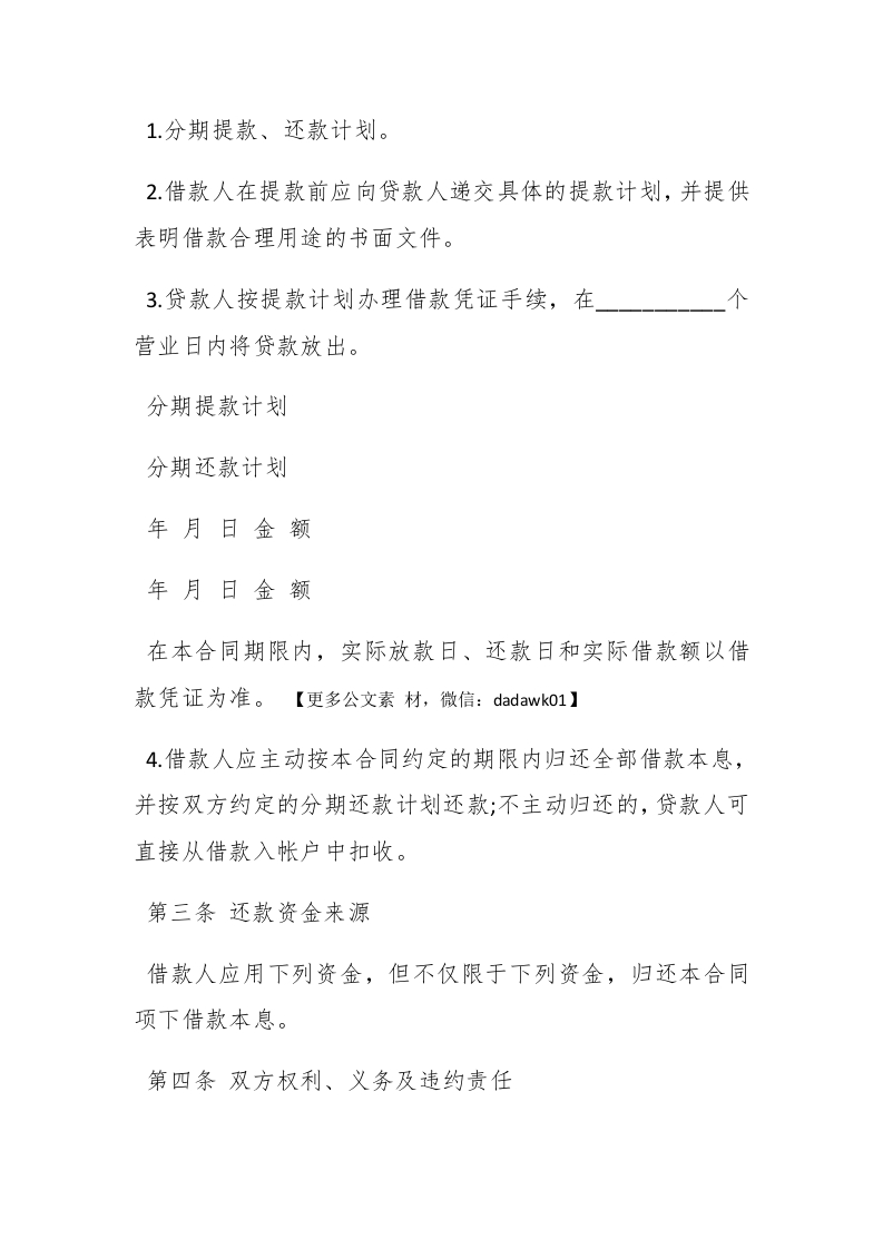 个人信用借款合同信用借款是指企业凭借自己的信誉从银行取得的借款。那么对于个人信用借款合同你了解多少呢?以下是查字典范文网小编整理的个人信用借款合同,欢迎参考阅读。个人信用借款合同范文一合同编号:#paidbegin#借款人:贷款人:中国****银行借款人因需要,向贷款人申请借款,贷款人同意向借款人发放上述贷款。经双方协商一致,根据有关法律法规和银行贷款管理规定,签订本合同,共同遵守。主要借款内容借款金额、用途、种类、利率、期限金额(大写)用途种类利率期限年个月(自年月日起至年月日止)2.本合同项下借款按日计息,按结息。在本合同有效期内,如遇利率调整,按中国人民银行有关规定执行。第二条提款和还款